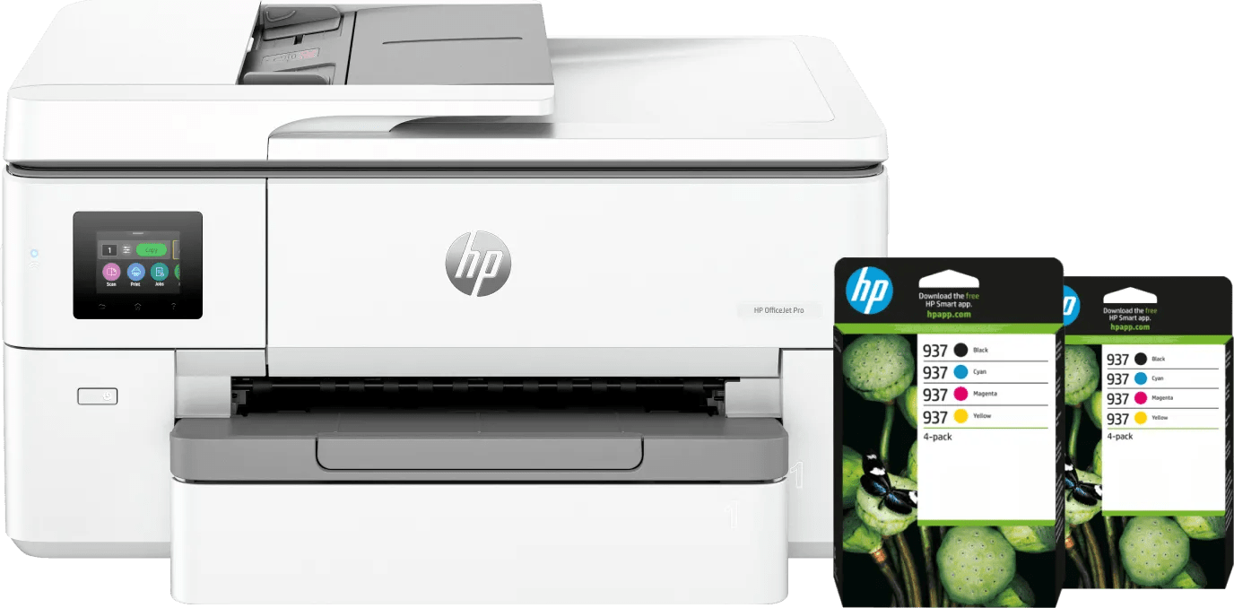Met de HP OfficeJet Pro 9720e + 2 zwarte + 2 kleuren cartridges heb je een flinke voorraad inkt in huis voor al je printopdrachten. Je ontvangt 2 zwarte en kleuren cartridges, waarmee je in totaal wel 2.900 zwart-wit en 1.600 kleurenpagina's print. Print brochures, flyers en posters met de HP OfficeJet Pro 9720e all-in-one A3 printer. Dankzij de hoge afdrukresolutie van 4.800 bij 1.200 dpi staan jouw ontwerpen scherp op papier. Met de automatische documentinvoer (ADF) scan en kopieer je tot 35 A3 vellen achter elkaar door. Door de afdruksnelheid van 22 pagina's per minuut wacht je niet lang op jouw beeldmateriaal. Verstuur je printopdrachten draadloos vanaf je smartphone of laptop via wifi. Of sluit de printer aan via een netwerkkabel of usb kabel. Geschikt voor HP Instant Ink Met het HP Instant Ink abonnement krijg je automatisch inkt thuisbezorgd en bespaar je op je printkosten. Bij deze printer ontvang je een gratis proefperiode van 3 maanden. Zo print je de eerste 3 maanden tot 700 pagina's gratis. Hierna betaal je een vast bedrag per maand. Je printplan pas je op elk gewenst moment aan. Zo zit je nergens aan vast. Meer informatie over HP Instant Ink? Bekijk ons adviesartikel. Printer met dynamische beveiliging Bepaalde HP-printers zijn bestemd om alleen te werken met cartridges die nieuwe of hergebruikte HP-chips of elektronische HP-circuits hebben. Deze printers gebruiken dynamische beveiligingsmaatregelen om cartridges te blokkeren die gebruikmaken van een chip of elektronische circuits die niet van HP zijn. Door periodieke firmware-updates wordt de effectiviteit van deze maatregelen behouden en blokkeren cartridges die eerder wel werkten. Hergebruikte HP-chips en elektronische HP-circuits maken gebruik van hergebruikte, gerecyclede en opnieuw gevulde cartridges mogelijk.