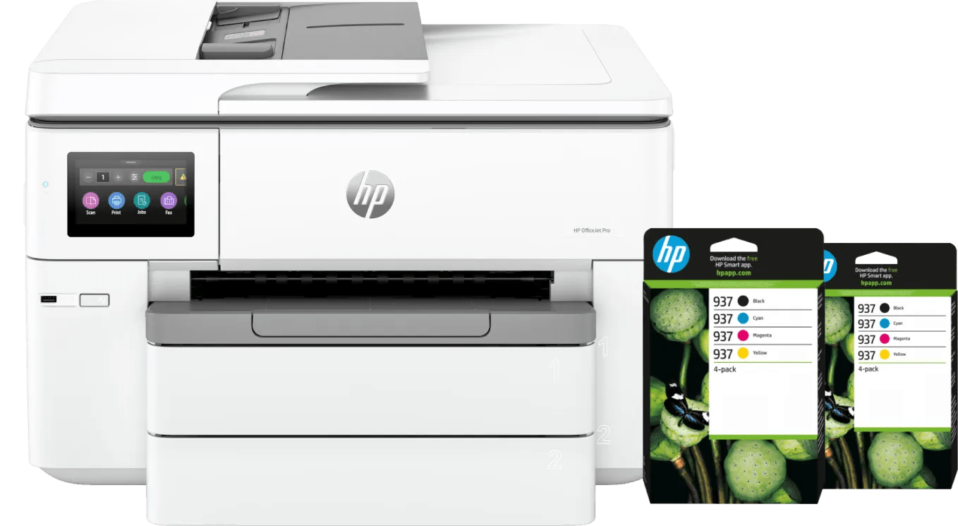 Met de HP OfficeJet Pro 9730 + 2 zwarte + 2 kleuren cartridges heb je een flinke voorraad inkt in huis voor al je printopdrachten. Je ontvangt 2 zwarte en kleuren cartridges, waarmee je in totaal wel 2.900 zwart-wit en 1.600 kleurenpagina's print. Print, kopieer en scan op A3 formaat met de HP OfficeJet Pro 9730e all-in-one inkjetprinter. Zo druk je naast A4 documenten ook flyers, brochures of posters af. Of scan een poster in en kopieer je flyers, met de OfficeJet Pro 9730e doe je het allemaal. Met de automatische dubbelzijdige documentinvoer kopieer of scan je automatisch een stapel papier. Dat scheelt tijd en handmatig werk. Print gemakkelijk via een usb kabel of stick. Of verstuur vanaf je bureau je printopdracht via wifi. Je vult niet vaak het papier bij dankzij de 2 papierladen, waar je in totaal tot 500 vellen papier in bewaart. Geschikt voor HP Instant Ink Met het HP Instant Ink abonnement krijg je automatisch inkt thuisbezorgd en bespaar je op je printkosten. Bij deze printer ontvang je een gratis proefperiode van 3 maanden. Zo print je de eerste 3 maanden tot 700 pagina's gratis. Hierna betaal je een vast bedrag per maand. Je printplan pas je op elk gewenst moment aan. Zo zit je nergens aan vast. Meer informatie over HP Instant Ink? Bekijk ons adviesartikel. Printer met dynamische beveiliging Bepaalde HP-printers zijn bestemd om alleen te werken met cartridges die nieuwe of hergebruikte HP-chips of elektronische HP-circuits hebben. Deze printers gebruiken dynamische beveiligingsmaatregelen om cartridges te blokkeren die gebruikmaken van een chip of elektronische circuits die niet van HP zijn. Door periodieke firmware-updates wordt de effectiviteit van deze maatregelen behouden en blokkeren cartridges die eerder wel werkten. Hergebruikte HP-chips en elektronische HP-circuits maken gebruik van hergebruikte, gerecyclede en opnieuw gevulde cartridges mogelijk.