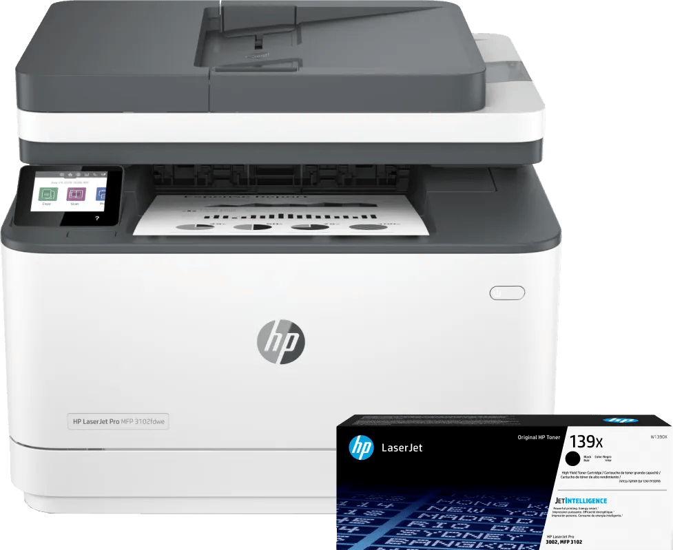 Ontvang genoeg inkt voor al je documenten met de HP LaserJet Pro MFP 3102fdw + 1 extra zwarte XL toner bundel. Met de extra zwarte XL toner print je tot wel 4.000 zwart-wit pagina's, waardoor je voorlopig genoeg inkt in huis hebt. De HP LaserJet Pro MFP 3102fdw is een snelle 4-in-1 printer voor je thuiswerkplek of klein kantoor. Je print en kopieert tot wel 33 pagina's per minuut. Wil je snel een groot document kopiëren of scannen? Dan leg je tot 50 pagina's per keer in de automatische documentinvoer. Ook fax je je werkdocumenten met de LaserJet Pro MFP 3102fdw. Printen doe je automatisch dubbelzijdig, zo bespaar je papier. De printer heeft een ingebouwd wifi netwerk. Je verbindt je laptop of telefoon dus direct met de printer.