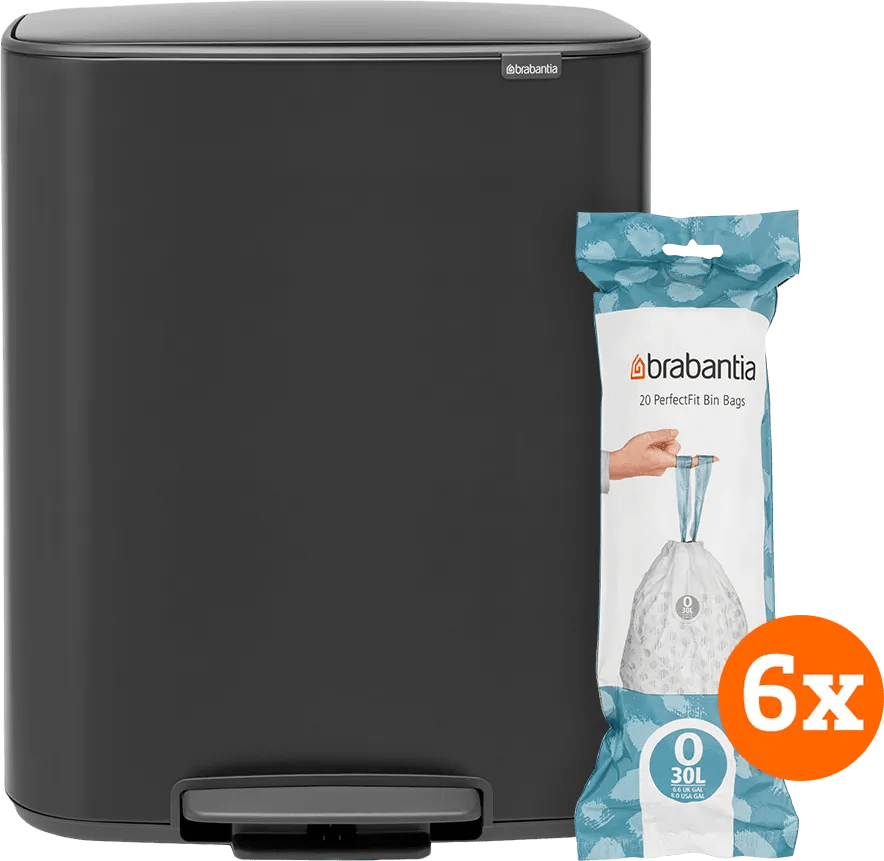 Met de Brabantia Bo Pedal Bin 2 x 30 Liter Matt Black + Vuilniszakken (120 stuks) vang je gelijk je afval op, dankzij de meegeleverde vuilniszakken. Dankzij de 2 binnenemmers scheid je gemakkelijk plastic of GFT van het restafval. De binnenemmers zijn uitneembaar, zodat je de vuilniszakken snel wisselt en de prullenbak makkelijk schoonmaakt. Handig, wanneer de ene zak sneller vol is dan de andere of wanneer er iets is gelekt in één van de bakken. Aan de zijkanten van de prullenbak zitten 2 handvatten, waarmee je de prullenbak gemakkelijk verplaatst. Je opent de prullenbak met je voet, zodat je handen vrij zijn voor het afval. Daarbij blijft de deksel schoon, doordat je deze niet aanraakt bij het openen.