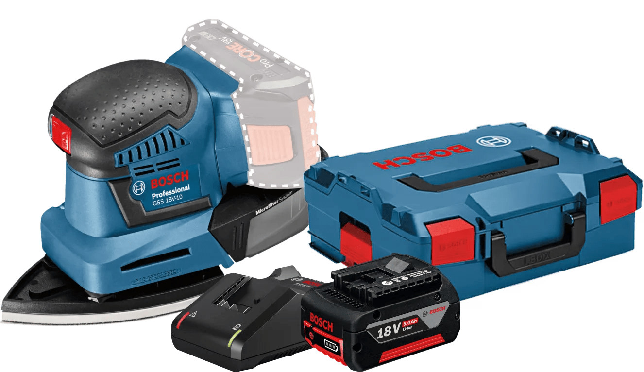 Start direct met jouw schuurklus met het Bosch Professional GSS 18V-10 5,0 Ah GBA Accu Starterspakket. Met de meegeleverde oplader laad je jouw accu op als deze leeg is. Je schuurt gemakkelijk randen, trappen, hoeken en kozijnen met de deltaschuurzool. De rechthoekige en vierkante schuurzool gebruik je voor grote, platte oppervlakken. Het schuurpapier vervang je gemakkelijk en snel door het klittenband of met de klem. Je houdt je werkplek schoon door de meegeleverde stofbak. De schuurmachine hoort bij het Bosch Professional 18V Systeem accu platform. Je gebruikt de meegeleverde accu daardoor ook op ander (tuin)gereedschap van dit accu platform.