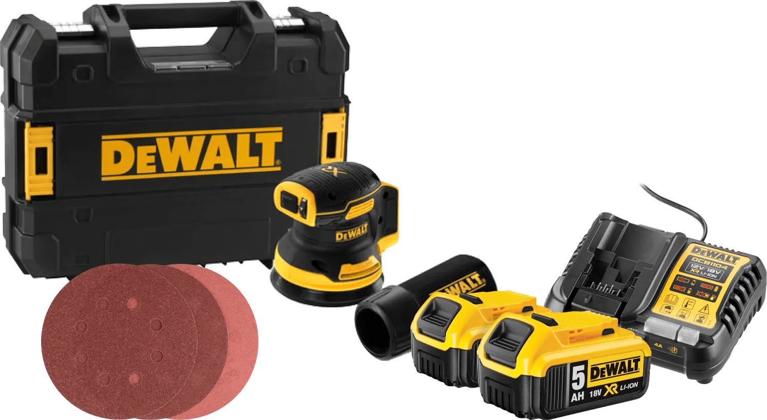 Met het DeWalt DCW210NT-XJ 5,0 Ah Accu (2x) Compleet Pakket werk je zonder onderbrekingen. Je krijgt de schuurmachine, 25 schuurschijven, 2 accu’s van 5,0 Ah en een snellader. Je schuurt meubels, deuren en andere werkstukken grof of fijn. De machine werkt op een accu, waardoor je hem overal gebruikt. Pas de snelheid aan op het materiaal, zodat je niet te veel wegneemt. Met een stofzak of stofzuiger houd je jouw werkplek schoon. De schuurmachine en accu’s horen bij het DeWalt XR 18V accu platform. Je gebruikt de accu’s daardoor ook op ander (tuin)gereedschap van dit platform,