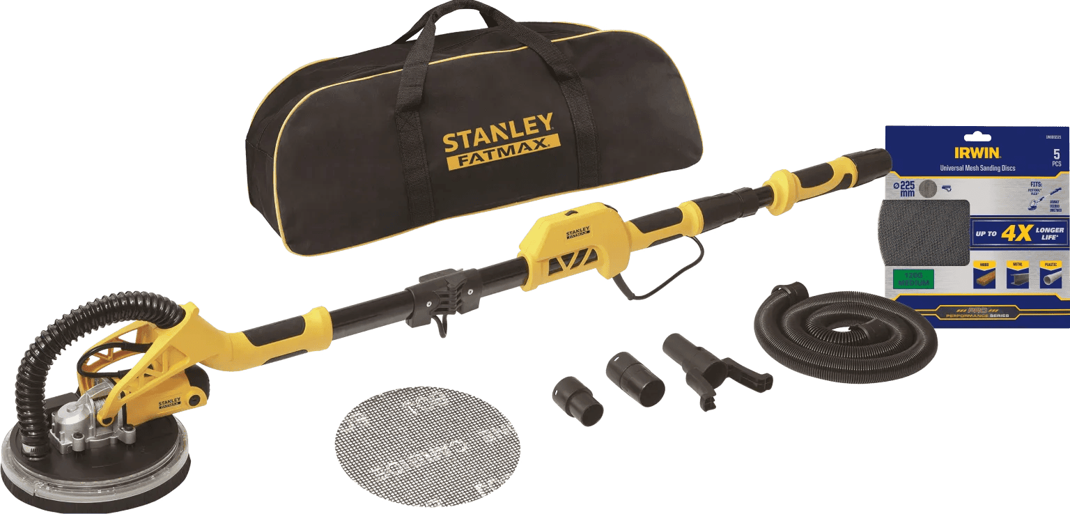 Schuur direct vloeren en plafonds met de Stanley Fatmax SFMEE500S-QS + Irwin Mesh Schuurgaas 225 mm K120 (5x). Door de uitschuifbare lans kom je gemakkelijk bij hoge en lage oppervlakken zonder ladder en zonder bukken. Het handvat verstel je namelijk tot 1,8 meter. Ook werk je probleemloos in donkere ruimtes door de led verlichting rondom de zool. Je voelt trillingen bijna niet in je armen door de lage trillingswaarde van 2,7 m/s². Het meegeleverde mesh gaas voert stof beter af dan andere schuurschijven. Het gaas heeft een doorsnede van 225 millimeter en een korrel van 120. Je gebruikt hem daardoor voor middelgrove schuurklussen.