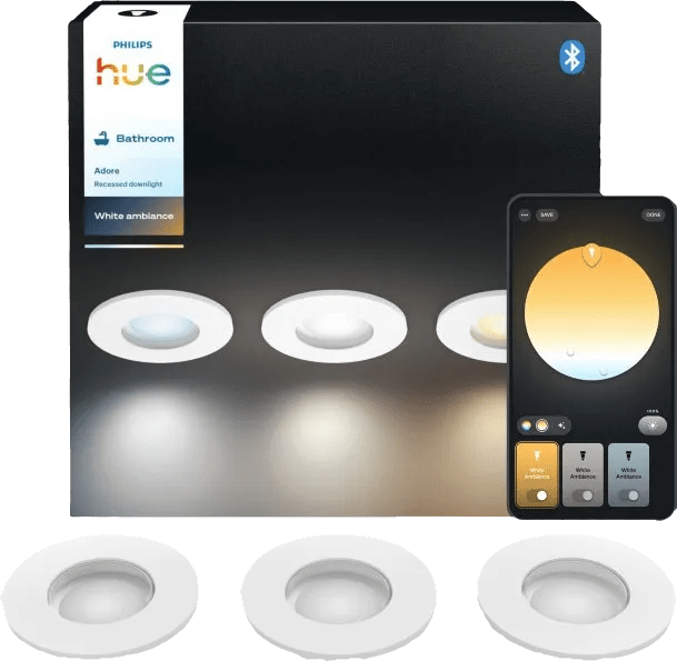 De Philips Hue Adore badkamerinbouwspot White Ambiance Wit 3-pack brengt extra sfeer in je badkamer. Je bouwt de spots in het plafond in, waardoor je een strakke uitstraling krijgt. Deze lampen zijn spatwaterdicht, waardoor je ze gerust in vochtige ruimtes gebruikt. De spots geven alle tinten wit licht, waardoor je altijd de juiste lichttint kiest. Je stelt de lampen naar wens in via de Philips Hue app. Dit doe je via bluetooth of met een Philips Hue Bridge via internet. Met een Bridge bestuur je de lampen ook buitenshuis en stel je vaste routines in. Zo gaan de lampen automatisch aan op bepaalde tijden, of als jij thuiskomt. Zonder Bridge bestuur je de spots alleen binnen bluetooth bereik.