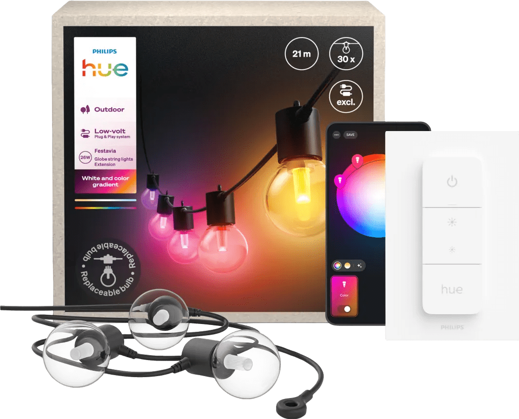 Met het Philips Hue Festavia outdoor Lichtslinger - 21 meter- Uitbreiding + Draadloze Dimmer bedien je jouw lichtsnoer sneller en makkelijker. Dankzij de extra lengte van 21 meter en 30 lampjes verlicht je direct een groot deel van je tuin of balkon. De lampjes geven warm wit en gekleurd licht en stel je via bluetooth in de Hue app. Omdat dit een uitbreiding is, gebruik je hem alleen met een Festavia basisset. De dimmer maakt het bedienen nog makkelijker: je dimt het licht zonder je telefoon te pakken en gebruikt hem los als afstandsbediening. Wil je vaste routines instellen of je lampen ook buitenshuis bedienen? Koppel je set dan aan een Hue Bridge Pro. Deze is niet meegeleverd.