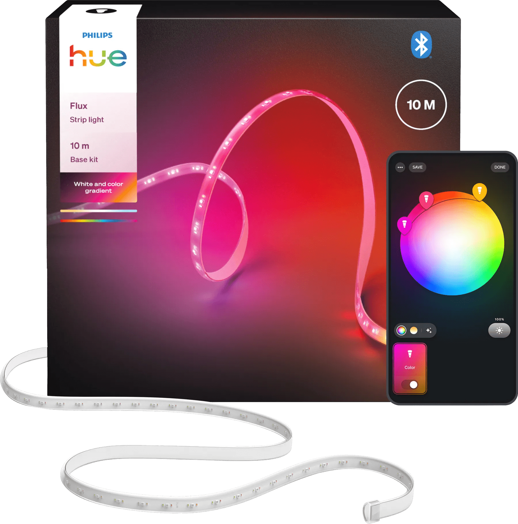 De Philips Hue Flux LED Strip van 10 meter en 2000lm is ideaal voor grote ruimtes of lange lichteffecten langs muren en plafonds. De strip geeft 16 miljoen kleuren licht en is dimbaar. Pas de LED strip aan voor elke passende gelegenheid, van een feestje tot een rustige avond. Je sluit de strip aan via bluetooth aan op stroom en koppelt de LED strip in de Philips Hue app, waardoor hij ook zonder Bridge werkt. De strip is al 10 meter lang en kan niet verder verlengd worden, maar je knipt hem wel makkelijk op maat zodat hij altijd past. Zonder Bridge bedien je maximaal 10 lampen en blijf je binnen 10 meter van de strip.