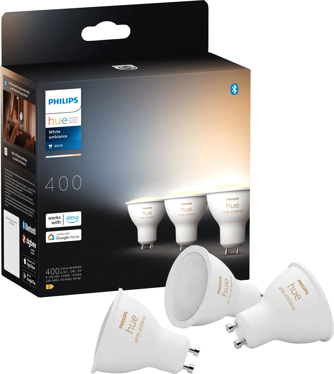 Met Philips Hue White Ambiance GU10 spots breng je sfeer in huis. De lampen geven namelijk alle tinten wit licht. Zo verander je de sfeer met één druk op de knop. Kies bijvoorbeeld voor helder wit licht tijdens je werk, of warm wit licht tijdens een avondje op de bank. Je bedient de Philips Hue lampen via bluetooth. Wil je de lampen ook buitenshuis bedienen en routines instellen? Dan koop je een Philips Hue Bridge. Met een Bridge schakelen de lampen bijvoorbeeld automatisch in als je thuiskomt. Je koppelt de lampen ook aan je slimme assistent. Zo zet je de lampen ook aan of uit met je stem.