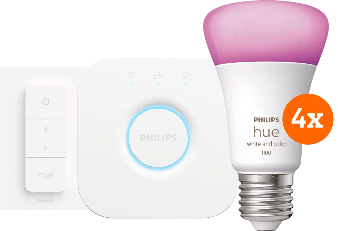 Start met smart verlichting met het Philips Hue White and Color E27 smart lamp startpakket met 4 lampen en een draadloze dimmer. Ook levert Philips standaard een Philips Hue Bridge mee met dit pakket. Daarmee bedien je jouw smart lampen altijd en overal. Ook als je niet thuis bent. Via de Hue app stel je verschillende kleuren en scènes in. Deze lampen geven 16 miljoen verschillende kleuren licht, en alle tinten wit licht. Zo zorg je altijd voor de juiste sfeer in je huis. Dankzij de meegeleverde dimmer bedien je de lampen ook zonder telefoon. Je dimt deze of schakelt ze in en uit. Je breidt de set later eenvoudig uit. Aan 1 Hue Bridge koppel je namelijk 50 smart lampen.