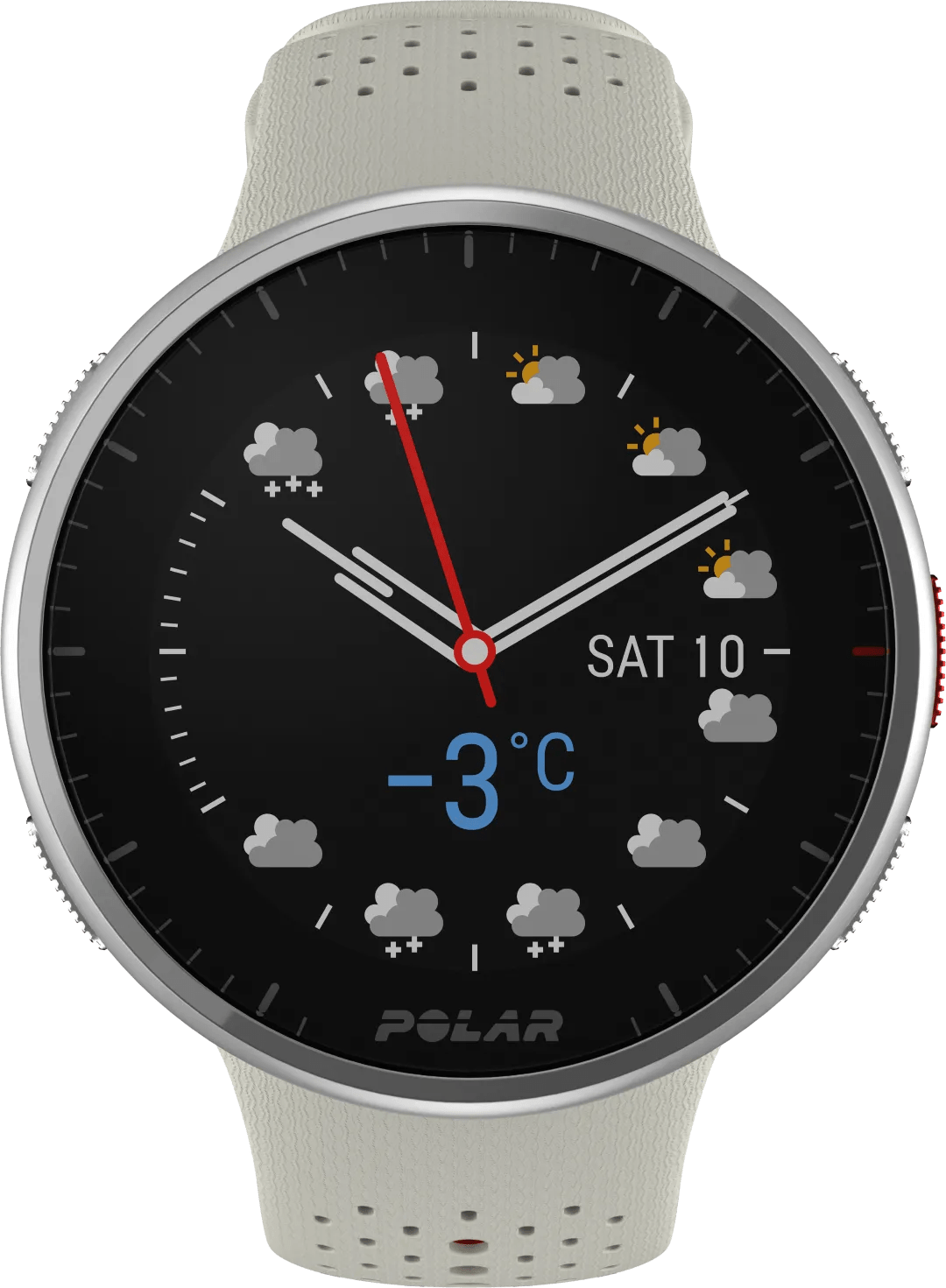 De Polar Pacer Pro Wit is een gps horloge voor de fanatieke hardloper. Dit horloge meet jouw hardloopprestaties nauwkeurig. Dankzij de ingebouwde gps laat je je smartphone thuis en houd je alsnog je routes bij. In Komoot plan je van te voren je eigen hardlooproutes en krijg je turn-by-turn routebegeleiding. Zo weet je precies welke kant jij op moet tijdens het rennen. Via de wandeltest krijg jij een goed inzicht in jouw conditie. Dit meet hij via de VO2 max functie. Ook houd je je prestaties bij met de Prestatie Test. De ingebouwde barometer registreert je aantal dalingen en beklimmingen tijdens het hardlopen. Doe het horloge 's avonds niet af want tijdens je slaap meet hij het herstel van je lichaam. Je hoeft de Polar niet vaak op te laden, bij gemiddeld gebruik gaat hij wel 7 dagen mee. Let op: je krijgt geen adapter meegeleverd. Wil je het horloge opladen via het stopcontact? Gebruik de adapter van je telefoonoplader of bestel er een losse adapter bij. Dit horloge is aanbevolen voor een polsomtrek van 17 tot 19 centimeter.