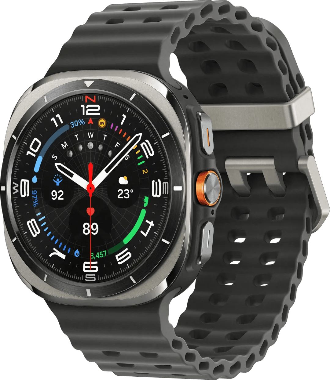 De Samsung Galaxy Watch Ultra (2025) 4G Titanium Zilver 47mm is een outdoorhorloge waarmee je je sportieve doelen behaalt en je prestaties verbetert. Je krijgt uitgebreid inzicht in zowel je fysieke als mentale gezondheid. Zo weet je onder andere meer over je slaappatroon en je stressniveau. Daarnaast krijg je persoonlijk trainingsadvies voor bijvoorbeeld het rennen van een marathon. Het horloge is gemaakt van sterk titanium en saffierglas. De Watch Ultra kan daardoor tegen een stootje en is ook bestand tegen extreme kou en hoogtes. Dankzij de ingebouwde eSim bel en stuur je berichten met deze smartwatch, ook als je jouw smartphone niet bij je hebt. Je hebt dan wel een apart 4G eSim abonnement nodig. Het opslaggeheugen is 2 keer zo groot als van zijn voorganger, je bewaart dus nog meer muziek op het 64 GB opslaggeheugen. Bij gemiddeld gebruik gaat de batterij 2 tot 3 dagen mee. Dit horloge is aanbevolen voor een polsomtrek van 17 tot 19 centimeter. Let op: je krijgt geen oplader meegeleverd. Wil je het horloge opladen via het stopcontact? Gebruik de oplader van je smartphone of bestel er een losse lader bij.