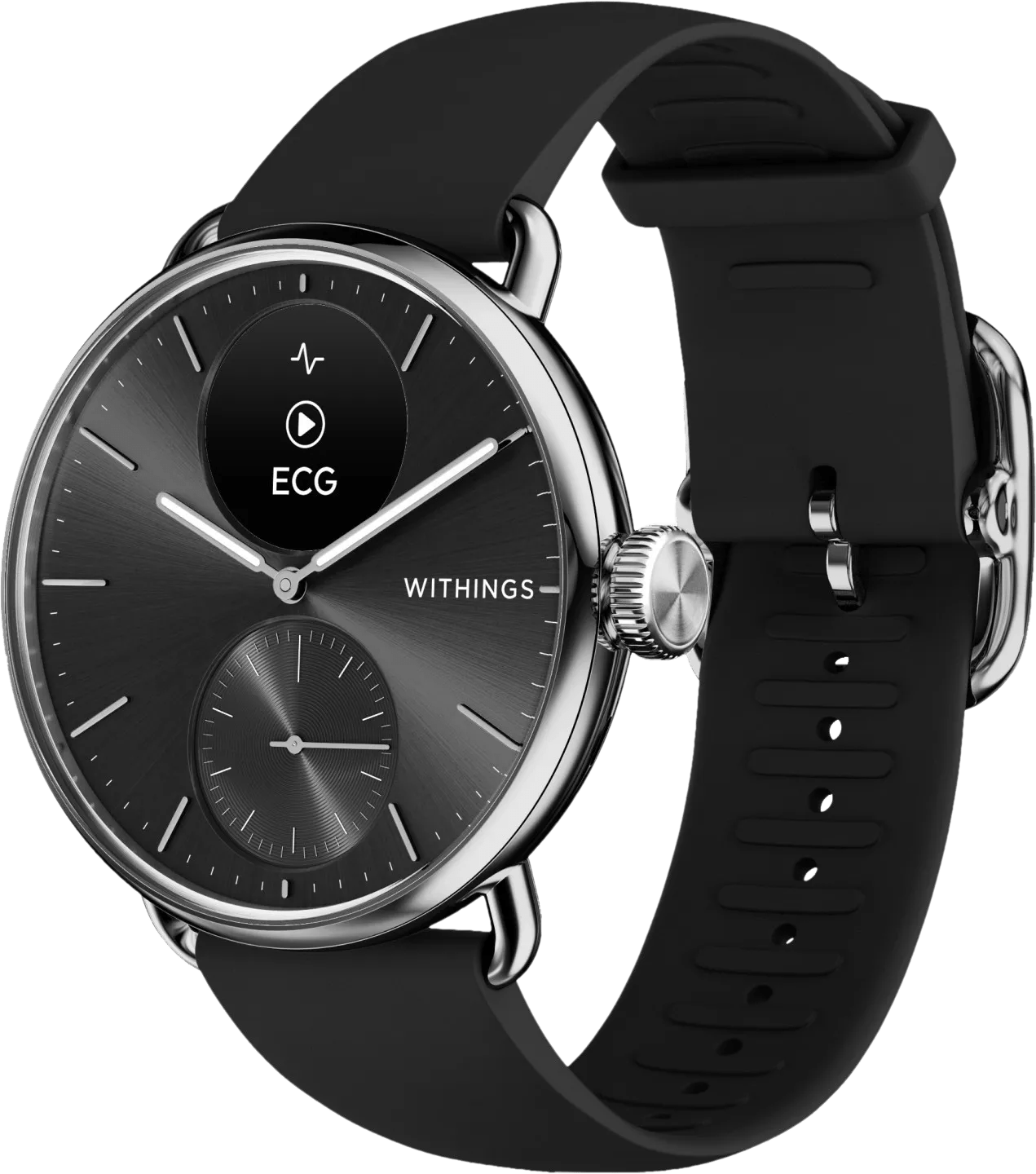 Met de stijlvolle Withings ScanWatch 2 Zwart 38 mm houd je naast de tijd ook je gezondheid in de gaten. Dit hybride horloge ziet eruit als een standaard horloge, maar heeft een klein digitaal scherm en geavanceerde sensoren. Je meet bijvoorbeeld dag en nacht je lichaamstemperatuur, zodat je snel ziet wanneer je temperatuur afwijkt. Dat kan betekenen dat je ziek bent of gaat worden en het even rustiger aan moet doen. Met de hartslagsensor maak je hartfilmpjes en ontdek je mogelijke hartritmestoornissen. De ScanWatch 2 meet je slaap en geeft je 's ochtends een slaapscore. Omdat het digitale scherm klein is, bekijk je uitgebreidere data in de Withings app. De batterij gaat 30 dagen mee na 1 keer opladen.