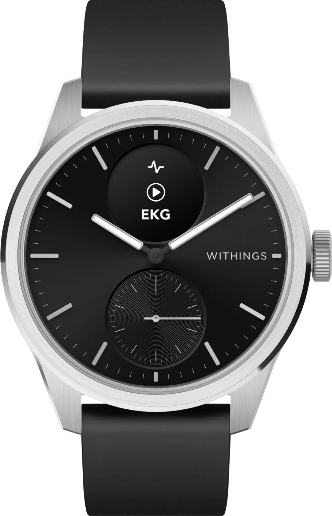 Met de stijlvolle Withings ScanWatch 2 Zwart 42 mm houd je naast de tijd ook je gezondheid in de gaten. Dit hybride horloge ziet eruit als een standaard horloge, maar heeft een klein digitaal scherm en geavanceerde sensoren. Je meet bijvoorbeeld dag en nacht je lichaamstemperatuur, zodat je snel ziet wanneer je temperatuur afwijkt. Dat kan betekenen dat je ziek bent of gaat worden en het even rustiger aan moet doen. Met de hartslagsensor maak je hartfilmpjes en ontdek je mogelijke hartritmestoornissen. De ScanWatch 2 meet je slaap en geeft je 's ochtends een slaapscore. Omdat het digitale scherm klein is, bekijk je uitgebreidere data in de Withings app. De batterij gaat 30 dagen mee na 1 keer opladen. Dit horloge is aanbevolen voor een polsomtrek van 15 tot 17 centimeter.