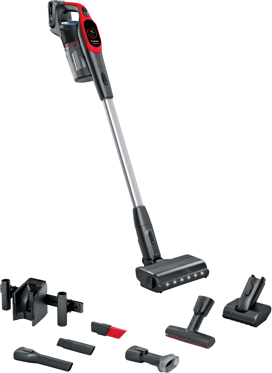 De Bosch Unlimited 9 BBS931PET Pro Animal is een handige stofzuiger voor jou als je huisdieren hebt. Je ontvangt namelijk een uitgebreide set accessoires, waarmee je verschillende oppervlakken in huis gemakkelijk stofzuigt. Met de mini turboborstel haal je bijvoorbeeld dierenharen zonder moeite van beklede meubels. Dankzij MicroClean-technologie meet de stofzuiger hoe schoon je vloer wordt. Als de gekleurde ring op de stofzuiger blauw kleurt, weet je dat je vloer schoon is. Zo stofzuig je altijd grondig. Dankzij de ingebouwde stofcompressor in de stofbak, leeg je de stofbak minder vaak. De compressor perst het vuil namelijk samen. Met de maximale batterijduur van 60 minuten stofzuig je gemakkelijk een hele verdieping. Het HEPA filter houdt tot 99,99 procent van de kleine stofdeeltjes tegen.