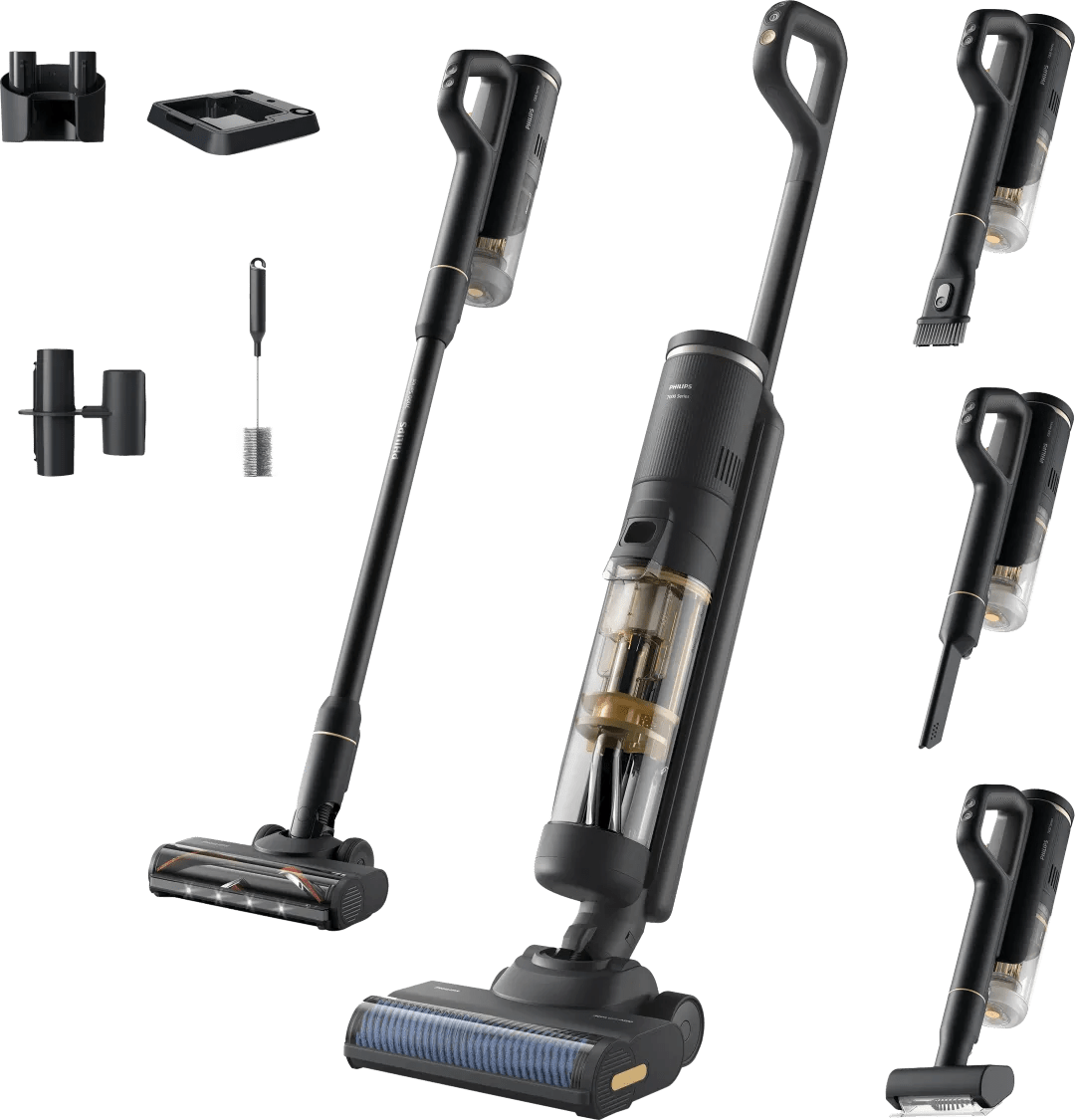 Met de Philips AquaTrio series 7000 XW7264/11 haal je een steelstofzuiger én een dweilstofzuiger in huis. Je ontvangt namelijk een motorunit met een stofzuigersteel en een dweilstofzuigersteel. Met de gewone stofzuigersteel stofzuig je harde vloeren en tapijt zoals je gewend bent. Met de dweilstofzuigersteel stofzuig en dweil je tegelijk. Zo haal je naast stof en haren ook natte vlekken en etensresten in één beweging van de vloer. Daarnaast gebruik je de motorunit ook als kruimelzuiger. Hiermee haal je snel wat kruimels van je keukentafel of aanrechtblad. De dweilborstel reinigt zichzelf automatisch in het meegeleverde basisstation. Op een volle accu maak je tot 80 vierkante meter vloeroppervlak schoon in de dweilstand. De dweilborstel draait 2.500 keer rond per minuut.