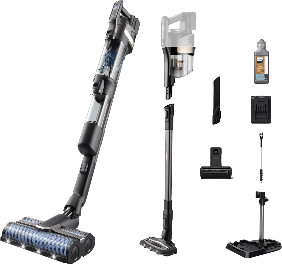 Met de Philips AquaTrio series 9000 XW9463/11 stofzuig en dweil je grote vloeroppervlakken in één keer. Op een volle accu maak je namelijk tot 240 vierkante meter vloeroppervlak schoon. De dubbele dweilborstels in de dweilstofzuigersteel draaien 4.000 keer per minuut rond. Hierdoor halen ze stof, kruimels en natte etensresten gemakkelijk en snel van je vloer. Gebruik je de gewone stofzuigersteel? Dan stofzuig je ook tapijt grondig schoon. Op de voorkant van beide stofzuigerstelen vind je een led lamp. Deze led lamp schijnt op je vloer terwijl je schoonmaakt, waardoor je geen vuil over het hoofd ziet. Als je vloer schoon is, plaats je de dweilborstel in het basisstation. Hier spoelt de borstel automatisch schoon. Zo hoef je dit niet zelf te doen.