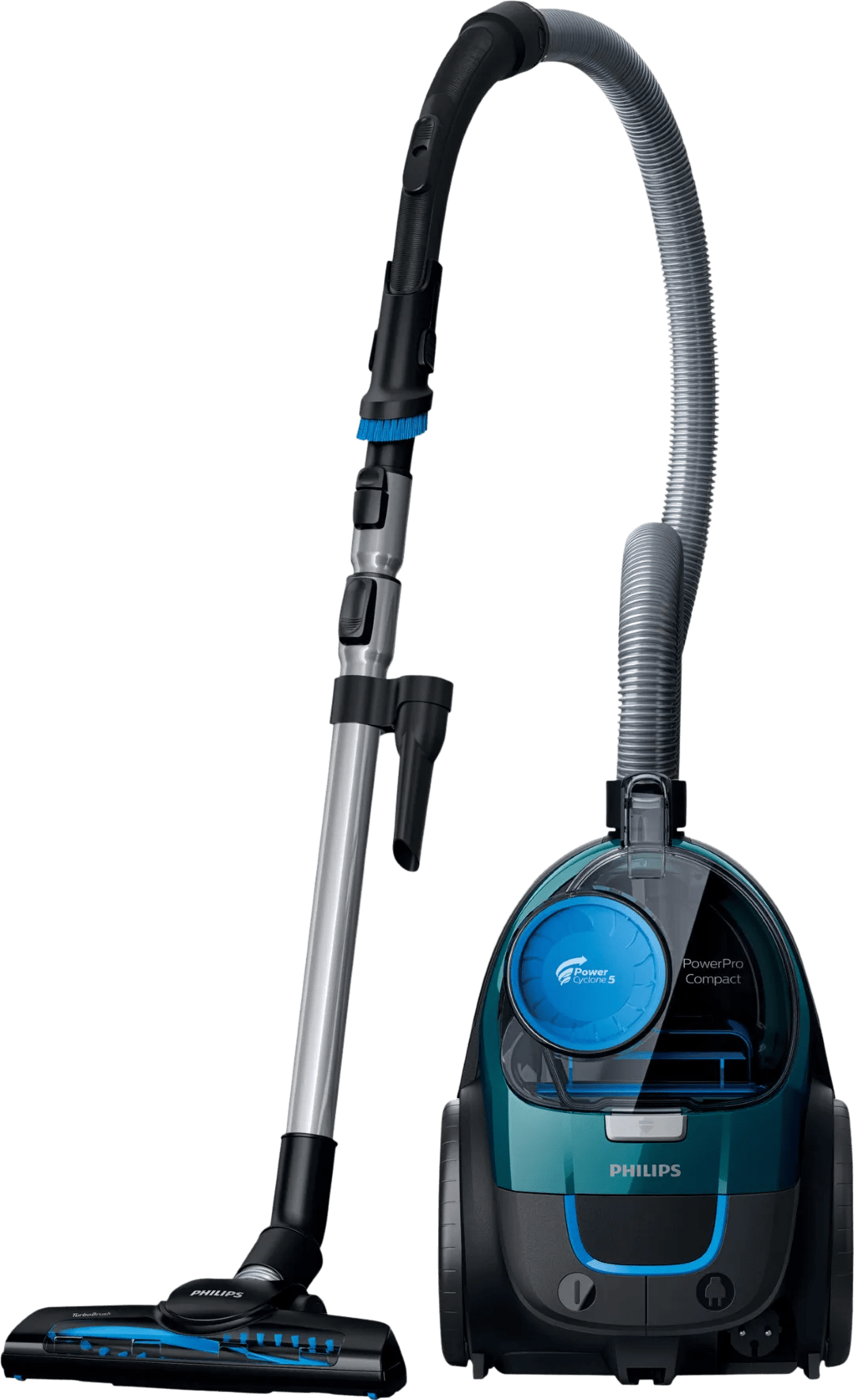 Met de Philips FC9334/09 PowerPro Compact stofzuig je elk vloertype gemakkelijk en grondig. Met de combiborstel stofzuig je harde vloeren en fijn tapijt. Omdat de borstel ook aan de zijkant stof en kruimels opzuigt, maak je beter schoon langs muren. De parketborstel werkt goed op kwetsbare houten vloeren, omdat hij zachte haren heeft. Zo voorkom je krassen. Met de turboborstel stofzuig je extra grondig. De ronddraaiende borstel tilt vuil en dierenharen gemakkelijk op, ook uit grove tapijten. Door het kleine formaat berg je deze stofzuiger netjes op. Ook til je 'm gemakkelijk op als je de trap op loopt. Dankzij de PowerCyclone 5 techniek voorkom je dat de stofzuiger zuigkracht verliest. De stofzuiger scheidt namelijk vuil van de luchtstroom.