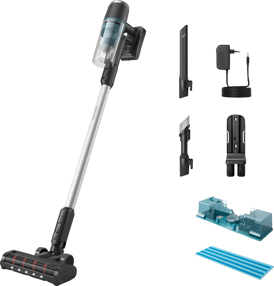 Met de Philips series 3000 XC3133/01 en stofzuig en dweil je jouw vloeren in één beweging. Je plaatst de dweilmodule en verwijdert zo ook vlekken en fijnstof van je vloer. Het LED-mondstuk maakt elk vuiltje zichtbaar, zodat je geen stof overslaat. Omdat het mondstuk tot op 1 millimeter langs plinten beweegt, bereik je ook lastige plekken. De steelstofzuiger gebruik je tot 60 minuten op een volle accu. In de turbomodus is dit 15 minuten. Dankzij de verwisselbare batterij verdubbel je de gebruiksduur gemakkelijk. Maak van de steelstofzuiger een handstofzuiger en reinig elk oppervlak in huis. Met de 2-in-1 borstel en het kierenmondstuk verwijder je stof van je keukenblad of van achter de bank. Na de schoonmaak laad je de stofzuiger op aan de wandoplader.