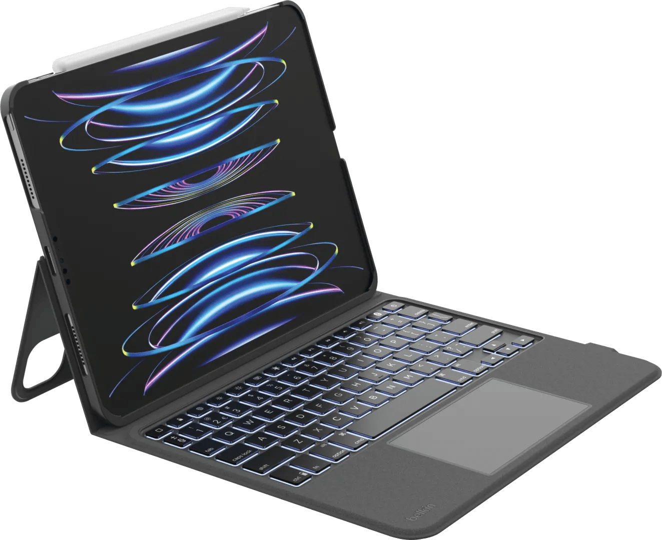 Tik snel en gemakkelijk e-mails en verslagen op je iPad (2025/2022) met de Belkin Apple iPad (2025/2022) Toetsenbord Hoes QWERTY. Dit doe je ook ’s avonds, want de toetsen zijn verlicht. Met het trackpad navigeer je gemakkelijk door de menu’s van je tablet. Je vouwt de achterkant om tot een standaard, waardoor je jouw iPad rechtop neerzet. Klik je iPad (2025/2022) gemakkelijk op de hoes en verbind je iPad via Bluetooth met het toetsenbord. Gebruik je het toetsenbord niet? Je haalt de tablet er gemakkelijk af. Wanneer je de hoes openklapt, beschermt hij alleen de achterkant van je iPad.