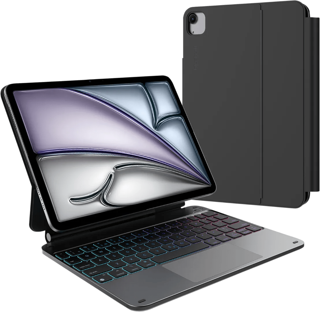 Verander je iPad Air (2025/2024) 11 inch in een kleine laptop met de BlueBuilt Toetsenbord Hoes QWERTY Zwart. Met het toetsenbord tik je gemakkelijk e-mails of verslagen. Dit doe je ook ’s avonds, want de toetsen zijn verlicht. Je kiest zelf de kleur van de verlichting. Met het trackpad navigeer je gemakkelijk door de menu’s van je tablet. Door de standaard zet je jouw iPad Air (2025/2024) 11 inch rechtop neer. Je draait de tablet in de hoek die je wilt, zodat je het scherm goed ziet. Dit is handig tijdens het typen of wanneer je naar een film of serie kijkt. Dankzij de magnetische flap zit de hoes stevig dicht wanneer je jouw tablet bijvoorbeeld meeneemt in je tas. Je Apple Pencil raak je niet kwijt, want deze bewaar je in de lus.