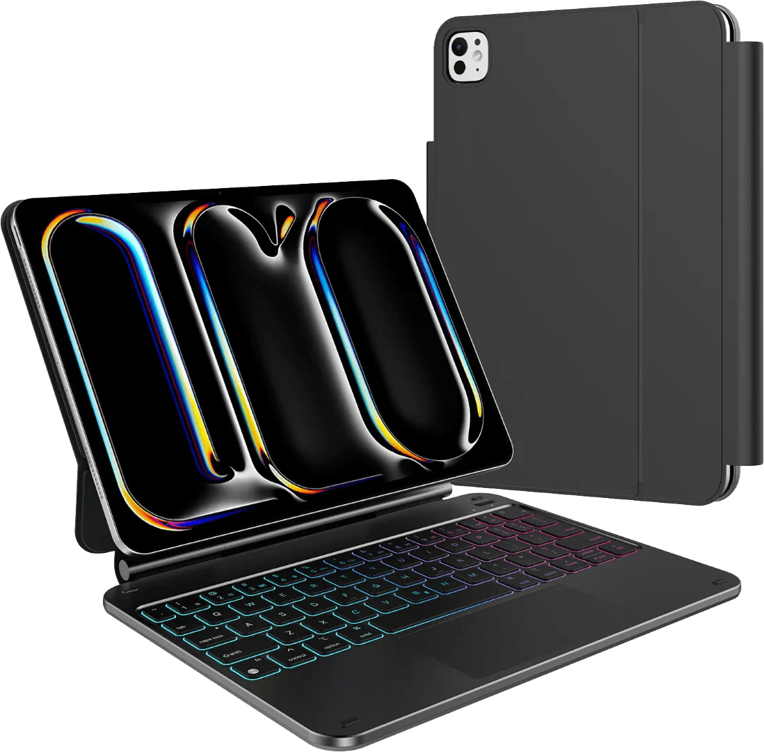 Verander je iPad Pro (2025/2024) 11 inch in een kleine laptop met de BlueBuilt Toetsenbord Hoes QWERTY Zwart. Met het toetsenbord tik je gemakkelijk e-mails of verslagen. Dit doe je ook ’s avonds, want de toetsen zijn verlicht. Je kiest zelf de kleur van de verlichting. Met het trackpad navigeer je gemakkelijk door de menu’s van je tablet. Door de standaard zet je jouw iPad Pro (2024) 11 inch rechtop neer. Je draait de tablet in de hoek die je wilt, zodat je het scherm goed ziet. Dit is handig tijdens het typen of wanneer je naar een film of serie kijkt. Dankzij de magnetische flap zit de hoes stevig dicht wanneer je jouw tablet bijvoorbeeld meeneemt in je tas. Je Apple Pencil raak je niet kwijt, want deze bewaar je in de lus.