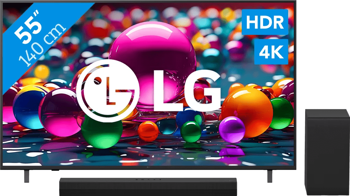 Geniet van 4K beelden en diepe bastonen met deze LG 55" QNED82 4K (2025) + LG DS60TR bundel. Televisie Kijk naar 4K beelden op een groot scherm met de LG 55" Smart UA75 4K (2025). Deze tv heeft een 4K resolutie. Hierdoor zie je 4 keer meer detail dan op een full hd tv. Je mist niets van je favoriete films, series of games. De 55 inch UA75 heeft webOS als smart platform. Zo heb je snel toegang tot apps en streaming services, zonder aparte mediabox of Chromecast. Je zet in een handomdraai een YouTube video of Netflix serie op. Soundbar Voeg meer bastonen aan je film of muziek toe met de LG DS40T. De meegeleverde subwoofer versterkt bastonen. Zo hoor je ze luid en duidelijk. De stevige bastonen zorgen voor meer diepte in films, waardoor je ze levendiger ervaart. De soundbar geeft surround sound, waardoor je geluid van verschillende kanten hoort. Hierdoor klinkt de film of serie realistisch.