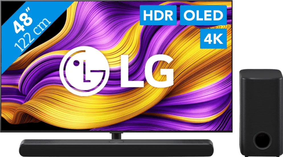 Geniet van realistische beelden en diepe bastonen met de LG 48" OLED EVO G56 4K (2025) + LG DS77TY bundel. Televisie Met de LG 48" OLED EVO G56 4K (2025) kijk je naar beelden met de diepste zwartwaarden en levendige kleuren. Het OLED EVO scherm bestaat uit miljoenen pixels die individueel verlichten of dimmen, zonder led achtergrondverlichting. Deze pixels kunnen zelfs helemaal uit, waardoor je écht zwarte beelden ziet. Zo geniet je van een krachtig contrast tussen donkere en lichte delen van het scherm. Lichtbronnen zoals een kampvuur schijnen realistisch, zonder grijze gloed. Soundbar De LG DS77TY verandert je woonkamer in een echte thuisbioscoop. Dankzij de meegeleverde subwoofer hoor je diepere bastonen. Hierdoor klinkt een concert levendiger en voelt het alsof je er echt bij bent. Dankzij Dolby Atmos geniet je van een echte surround sound ervaring. Door deze techniek weerkaatst geluid via het plafond en je wanden naar je zitplek. De kogels vliegen je om de oren als je een spannende actiefilm kijkt.