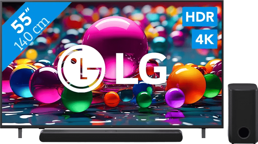 Geniet van realistisch beeld en geluid met de LG 55" 4K Smart UA75 + LG DS77TY tv en soundbar bundel. Televisie Kijk naar scherpe 4K beelden met de LG 55" Smart UA75 4K (2025). Deze tv heeft een 4K resolutie. Hierdoor zie je 4 keer meer detail dan op een full hd tv. Je mist niets van je favoriete films, series of games. De 55 inch UA75 heeft webOS als smart platform. Zo heb je snel toegang tot apps en streaming services, zonder aparte mediabox of Chromecast. Je zet in een handomdraai een YouTube video of Netflix serie op. Soundbar De LG DS77TY verandert je woonkamer in een echte thuisbioscoop. Dankzij de meegeleverde subwoofer hoor je diepe bastonen. Hierdoor klinkt bijvoorbeeld de opname van een concert indrukwekkend. In combinatie met Dolby Atmos geniet je van surround geluid. Dolby Atmos produceert geluid dat van alle kanten lijkt te komen. Dit komt goed tot zijn recht wanneer een helikopter over het hoofd van de hoofdrolspeler vliegt in een actiefilm.