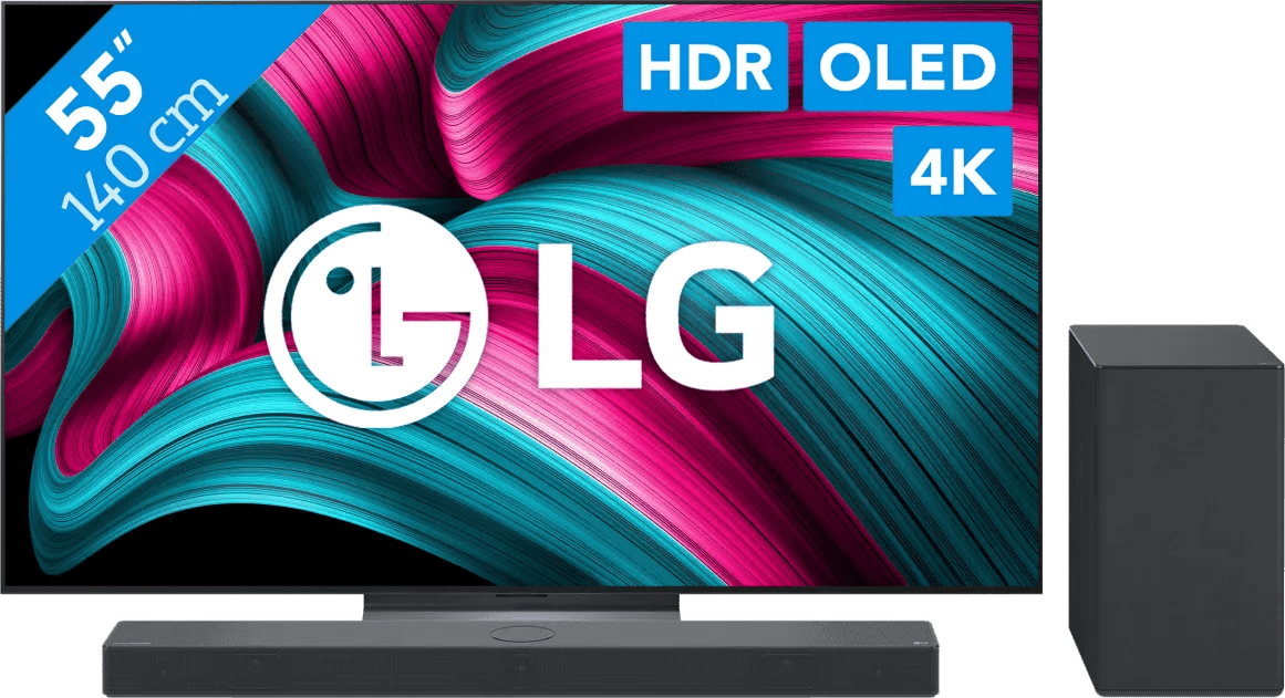 Geniet van realistische beelden en diepe bastonen met de LG 55" OLED EVO C54 4K (2025) + LG DSC9S bundel. Televisie Kijk naar realistische beelden met de diepste zwartwaarden op de LG 55" OLED EVO C54 4K (2025). De LG C54 heeft een OLED scherm. Elke pixel op het scherm verlicht of dimt individueel, zonder achtergrondverlichting. Deze pixels kunnen zelfs helemaal uitschakelen, waardoor zwart écht zwart is. Het contrast tussen donkere en lichte beelden is groot. Lichtbronnen zoals de koplampen van een auto schijnen fel en realistisch, zonder grijze gloed. Soundbar Je geniet van de diepste tonen met de LG DSC9S. Bij deze soundbar krijg je een subwoofer. Met deze subwoofer voel je de bastonen nog intenser en ga je helemaal op in je favoriete film en serie. De soundbar ondersteunt Dolby Atmos. Deze technologie weerkaatst het geluid via het plafond naar je luisterpositie. Hierdoor lijkt het geluid van alle kanten te komen en zit je midden in de muziek of film. Je bevestigt de soundbar aan je LG OLED C televisie met de meegeleverde muurbeugel.