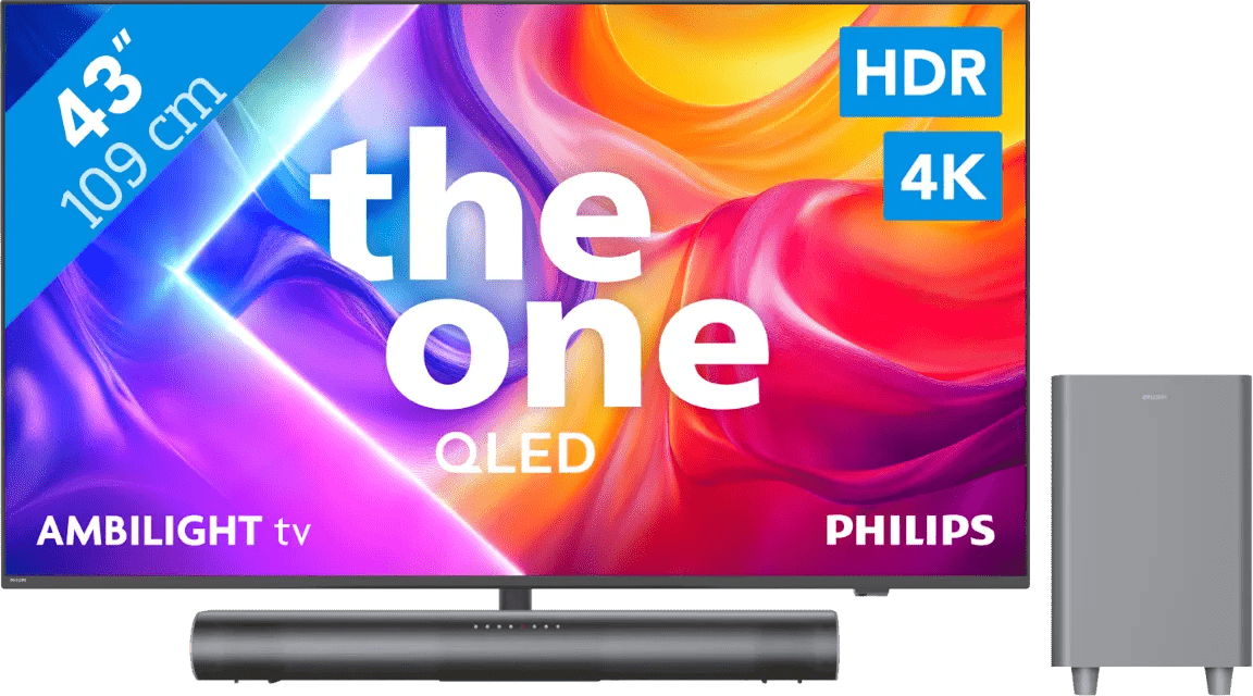 Geniet van kleurrijke beelden en diepe bastonen met de Philips Ambilight 43” PUS9000 QLED 4K (2025) + Philips TAB6100 tv en soundbar bundel.