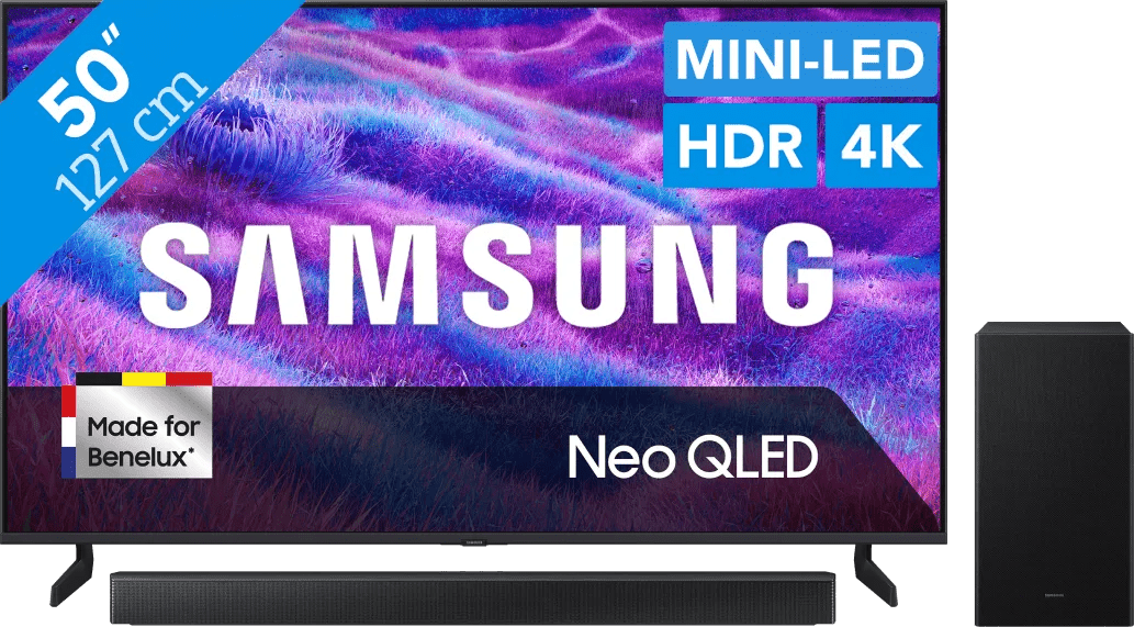 Verbeter het geluid van je tv met de Samsung 50″ Neo QLED QN82F 4K (2025) + Samsung HW-B66CF (2025) bundel.