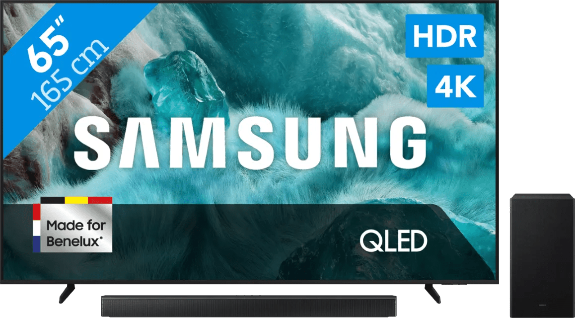 Kijk naar 4K beelden en geniet van diepe bastonen met de Samsung 65″ QLED Q7F4 4K (2025) + Samsung HW-B66CF (2025) bundel.