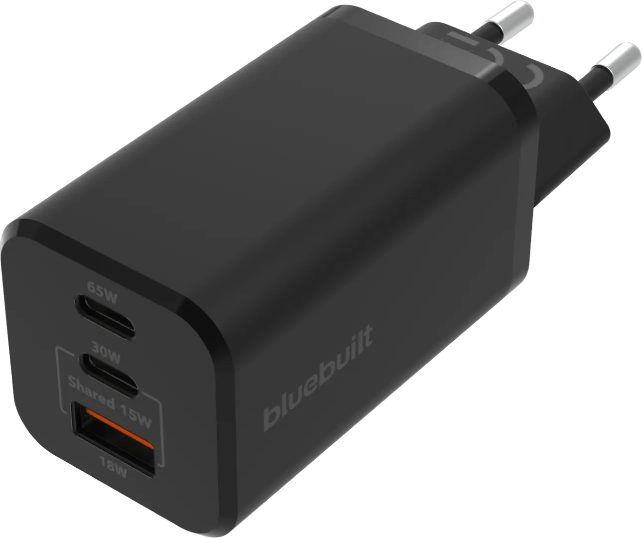 Met de BlueBuilt Power Delivery + Quick Charge Oplader met 3 Usb Poorten 65W Zwart laad je naast jouw laptop nog 2 andere apparaten op. De bovenste poort van deze krachtige oplader levert 65 watt vermogen, wat genoeg is voor de meeste laptops. Met de tweede usb C poort en de usb A poort laad je tegelijkertijd jouw smartphone en tablet op. Los hebben deze poorten 30 en 18 watt vermogen. Gebruik je ze tegelijkertijd? Dan leveren ze allebei 15 watt. Door de Power Delivery gaat het opladen veel sneller dan met een standaard oplader. Heeft jouw apparaat geen snellaadfunctie? Dat is geen probleem, ook deze laad je veilig op. De BlueBuilt oplader levert nooit meer vermogen dan je apparaat aan kan.