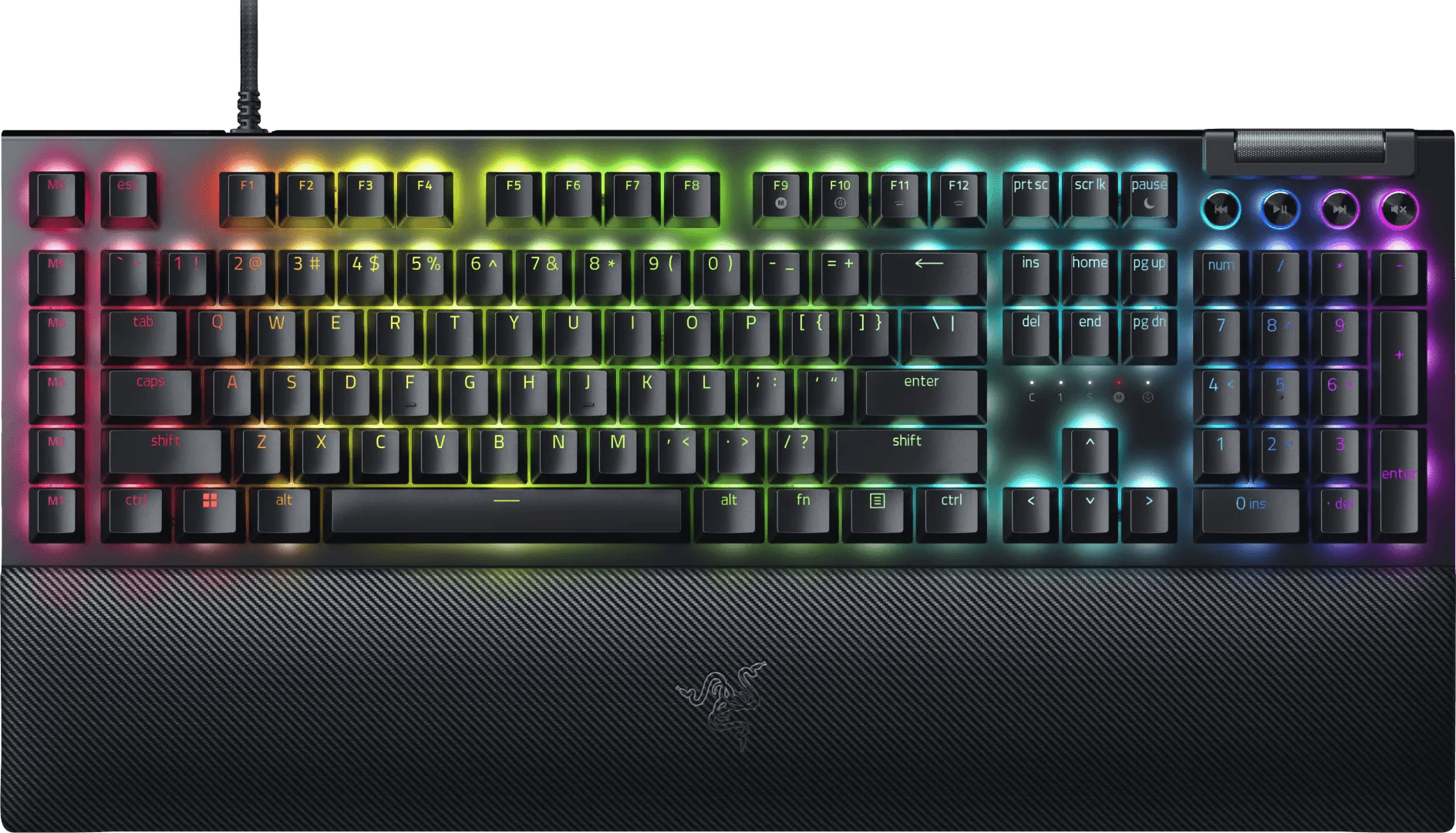 Speel je games altijd met nauwkeurige toetsaanslagen met het Razer BlackWidow V4 Mechanisch Gaming Toetsenbord. Dit bedrade gaming toetsenbord heeft Razer lineaire toetsen. Hierdoor voel en hoor je geen feedback wanneer je een toets indrukt. Bedien je volume via de dedicated media knoppen op je gaming toetsenbord en maak snelkoppelingen met de 6 macro toetsen. Zo pas je snel je instellingen aan tijdens het gamen. Dit is een volledig gaming toetsenbord met een numeriek blok. Hierdoor gebruik je jouw gaming toetsenbord ook voor andere dingen dan gaming. Je sluit dit gaming toetsenbord aan met de usb A kabel. Daardoor is het toetsenbord plug and play en gebruik je hem gelijk. Stel zelf de RGB verlichting in per toets via de Razer Synapse software en kies tussen 16,8 miljoen kleuren. Zo past jouw gaming toetsenbord bij de rest van je setup.