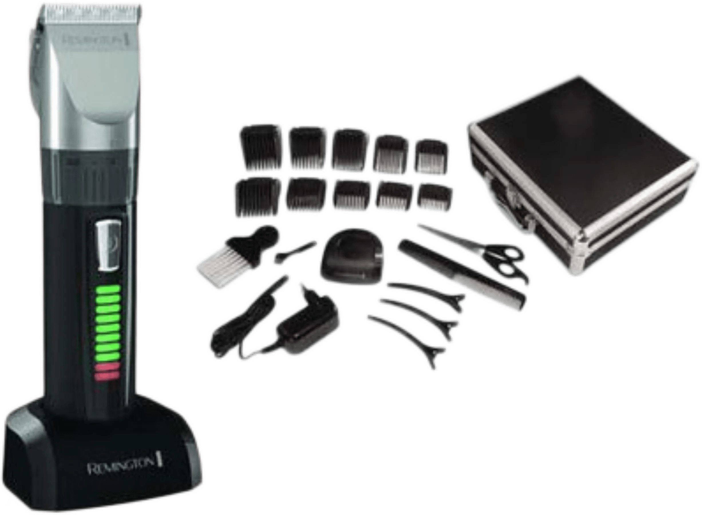 Met de Remington HC8510 Genius haal je een uitgebreide tondeuseset in huis. Deze set bestaat onder andere uit een kappersschaar, reinigingsborsteltje en 10 opzetkammen met een kniplengte van 3 tot 40 millimeter. Met de opzetstukken kies je de juiste kniplengte en dankzij het kliksysteem blijft de kniplengte tijdens de knipbeurt gelijk. Ga je voor een bijna kaal hoofd, dan gebruik je de tondeuse zonder opzetkam. Met het draaiwiel kies je uit 5 lengtes van 0,8 tot 2 millimeter. Met een volle accu gebruik je de tondeuse tot 50 minuten lang en op het display lees je af hoelang de accu nog mee gaat. Na gebruik berg je de tondeuse op in de meegeleverde koffer of plaats je `m in het laadstation.