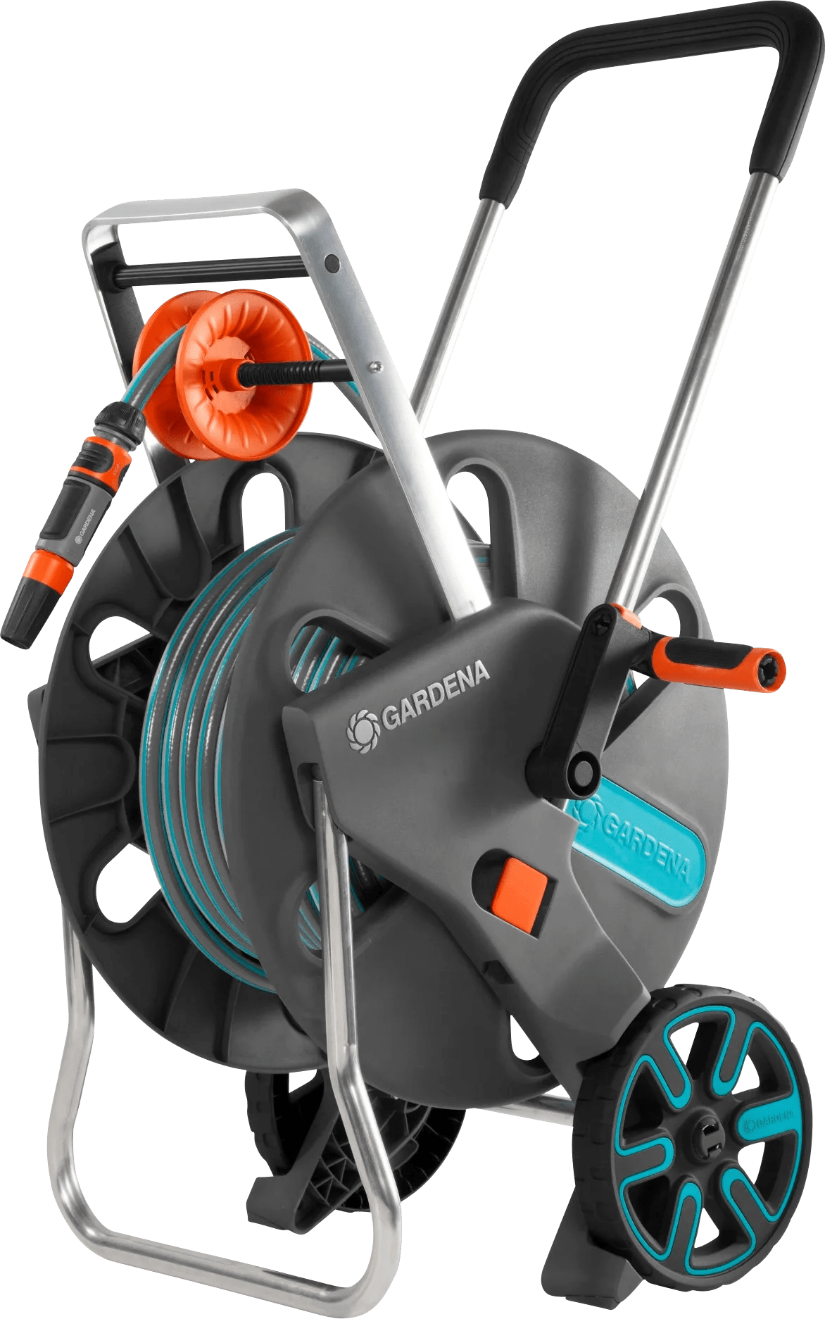 De Gardena Cleverroll L Easy Set wordt geleverd met een 50 meter lange tuinslang waardoor je geen enkel plekje in de tuin overslaat. Met de ergonomische hendel en de slanggeleider, rol je de tuinslang gelijkmatig op. De hendel is dankzij de softgrip zacht voor de handen. De slangenwagen is daarnaast uitgerust met het Kick and Stand systeem waarbij je het frame onder de wagen uitklapt en stabiel op de grond vastzet. Dankzij dit systeem blijft de slangenwagen dus altijd op zijn plek staan, ook wanneer je aan de slang trekt.