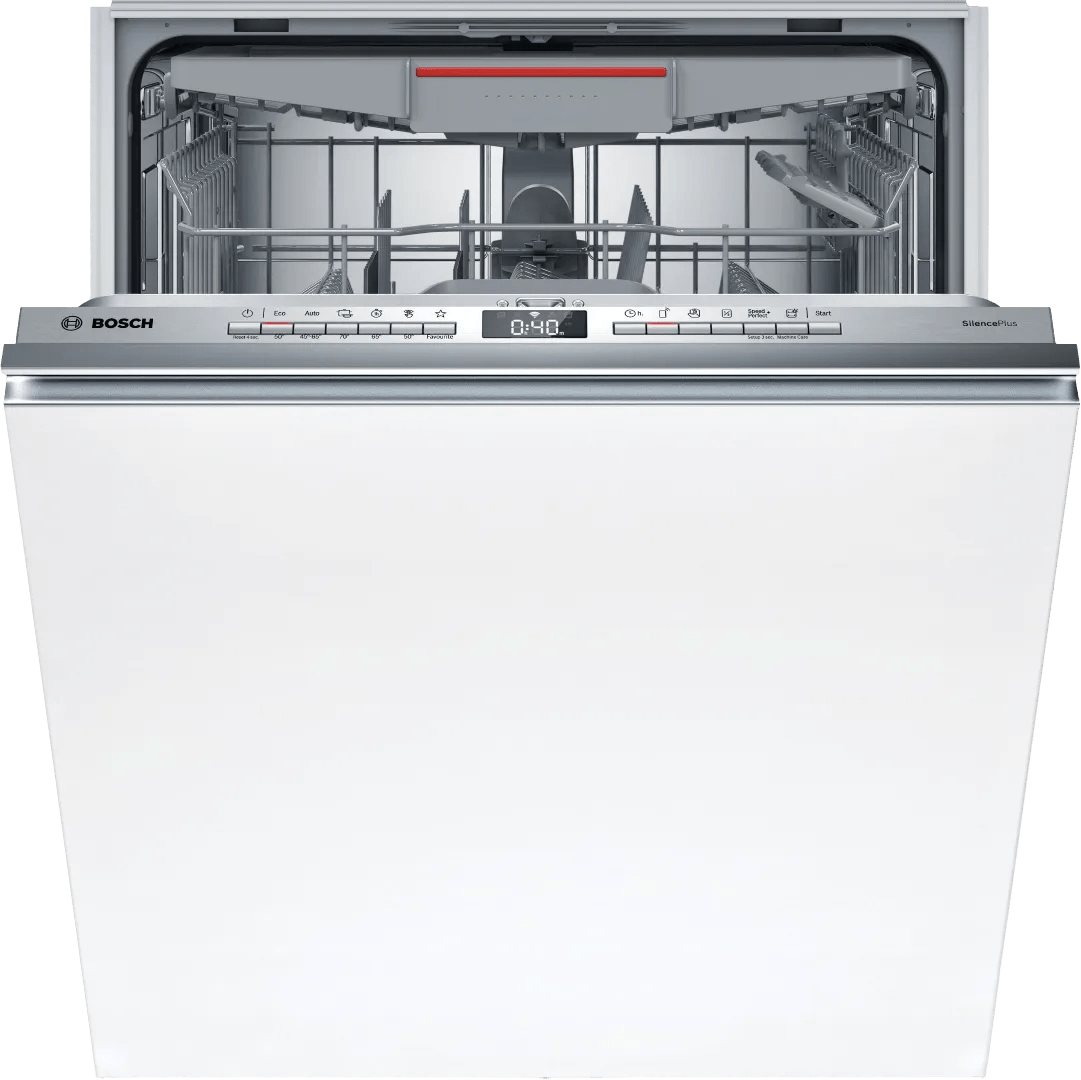 Je wast je vaat energiezuinig en snel met de Bosch SBV4EVX08E volledig geïntegreerde vaatwasser. Binnen in de vaatwasser heb je ruimte voor 14 couverts vuile vaat. Je bestek leg je in de bestekmand bovenin. Zo heb je meer ruimte voor pannen en ovenschalen. Heb je maar een kleine lading? Gebruik dan de halve belading functie. Wanneer je snel schone glazen en taartbordjes nodig hebt voor visite, kies je voor SpeedPerfect+. Hiermee kort je je vaatwasprogramma tot wel 75% in. Via de HomeConnect app bedien je de vaatwasser ook op afstand en zie je precies wanneer het programma klaar is. Na het programma opent de vaatwasser automatisch, waardoor je vaat extra goed droogt.