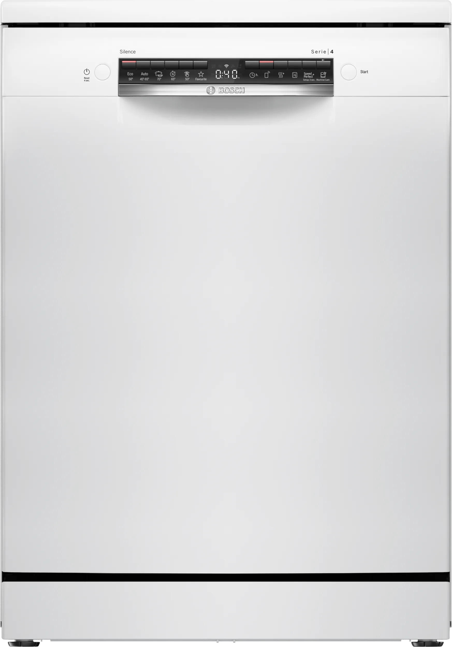De Bosch SMS4HVW14E is een vrijstaande vaatwasser die je ook met je smartphone bedient via de Home Connect app. Zo zet je vanuit de supermarkt een programma aan. Kies bijvoorbeeld voor het intensieve programma, wanneer je pannen zijn aangekoekt. Met SpeedPerfect+ verkort je de tijd. Handig, wanneer je snel schone bordjes nodig hebt. Je deelt de witte vaatwasser flexibel in dankzij de VarioFlex korven en VarioLade. De korven verstel je in hoogte en de lade gebruik je voor bestek, klein kookgerei en espressokopjes. Zo houd je in de onderste korf meer ruimte over voor grote potten en pannen. Met energieklasse C is de vaatwasmachine redelijk zuinig in gebruik. Je bespaart over de levensduur gemiddeld tot &euro: 125,- op je energiekosten.