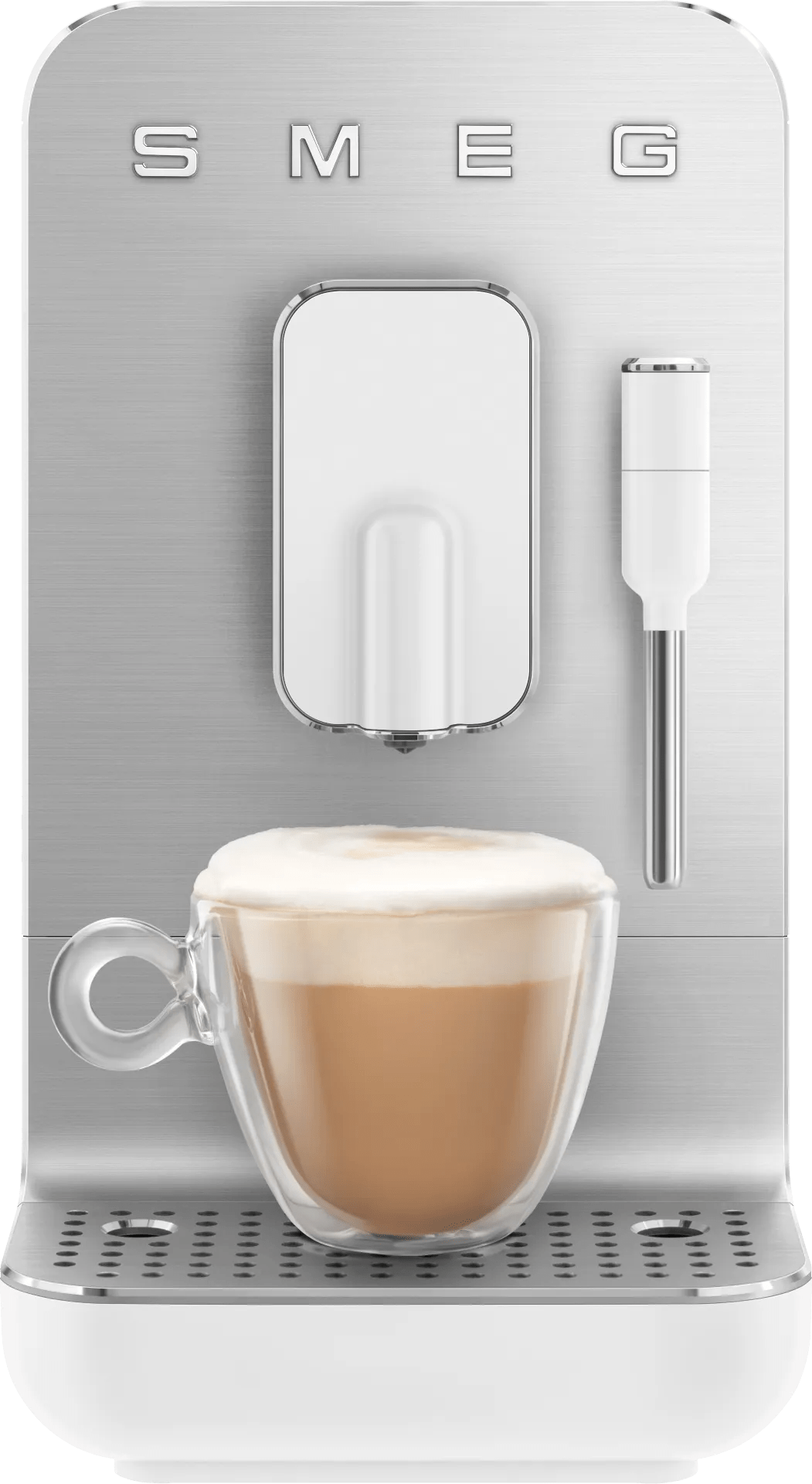 Met de SMEG BCC12WHMEU Wit zet je in een handomdraai melkspecialiteiten en tap je heet water voor een kopje thee. Via één druk op de intuïtieve touch knoppen bereidt de machine in enkele seconden een warme drank, zoals een espresso, dubbele espresso of americano. Met de automatische stoompijp schuim je melk op voor een cappuccino of latte macchiato. Het enige dat jij hoeft te doen is een kannetje met melk onder de stoompijp te houden. De koffie uitloop is verstelbaar, hierdoor passen zowel kleine als grote koppen onder de machine. Het koffiezetapparaat is compact van formaat en neemt hierdoor weinig ruimte in beslag op het aanrecht. Met zijn retro jaren `50 uitstraling, de glanzende profielen en het geborstelde aluminium voorpaneel is `ie een ware blikvanger in de keuken.