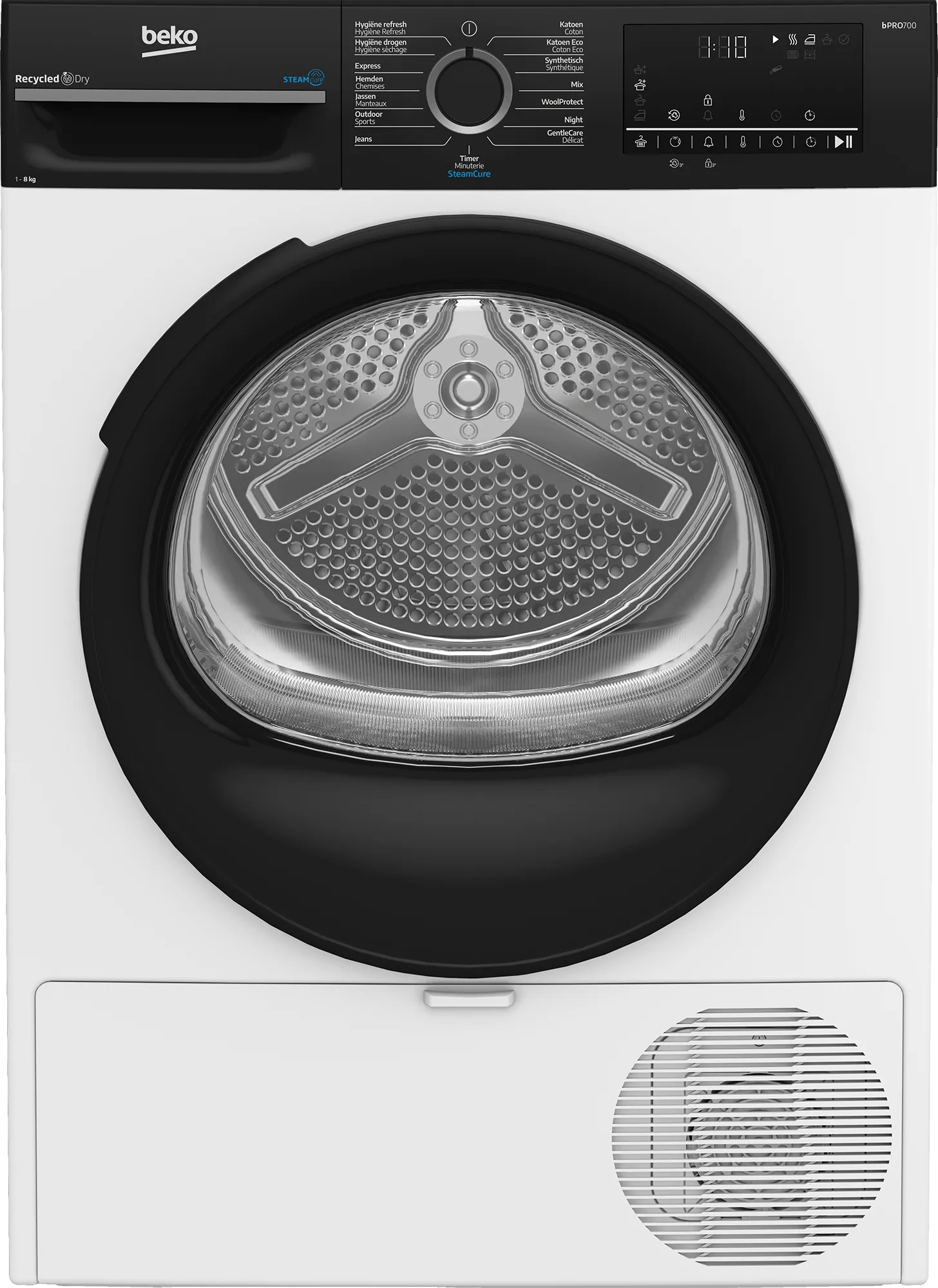 De Beko BM3T3824B warmtepompdroger frist je gedragen kleding snel op met stoom dankzij SteamCure. Je gebruikt deze stoomfunctie wanneer je shirt een beetje muf ruikt, maar nog geen vlekken heeft. Dit bespaart je een wasbeurt. De droger is met 8 kilogram vulgewicht geschikt voor het beddengoed van één tweepersoonsbed. Je dekbedovertrek en hoeslaken zijn in minder dan 3 uur droog, wat relatief snel is. Met energieklasse B bespaar je tot &euro: 280,- op je energiekosten over de levensduur. Zo bespaar je met deze warmtepompdroger tijd én energie. Je hebt keuze uit programma's voor bijvoorbeeld katoen, overhemden en jassen. Met de meegeleverde slang sluit je de droger op de afvoer aan. Je hoeft de condensbak dan niet te legen.