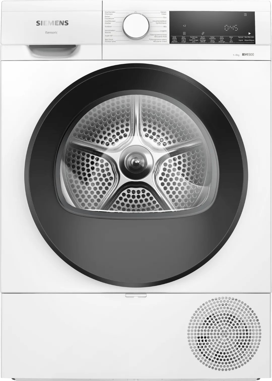 Je droogt kleine en middelgrote ladingen wasgoed in de Siemens WQ32G10MFG droogkast. Met 8 kilogram vulgewicht heb je ruimte voor kleding van een paar dagen of beddengoed van één tweepersoonsbed. Je kiest uit 1 van de 14 programma's voor handdoeken, lingerie of outdoorkleding. Heb je geen zin om je was te sorteren? Kies dan voor het mix programma. Wanneer je snel een droge broek en overhemd nodig hebt, kies je het Super 40' programma. Droog je maar een kleine lading van bijvoorbeeld een paar shirts? De droogkast stopt het droogprogramma automatisch wanneer je was droog is dankzij iSensoric. Hierdoor droog je nooit langer dan nodig, wat jou energiekosten scheelt. Bij deze droogkast zit geen afvoerslang. Koop deze er apart bij om de droogkast op de waterafvoer aan te sluiten.