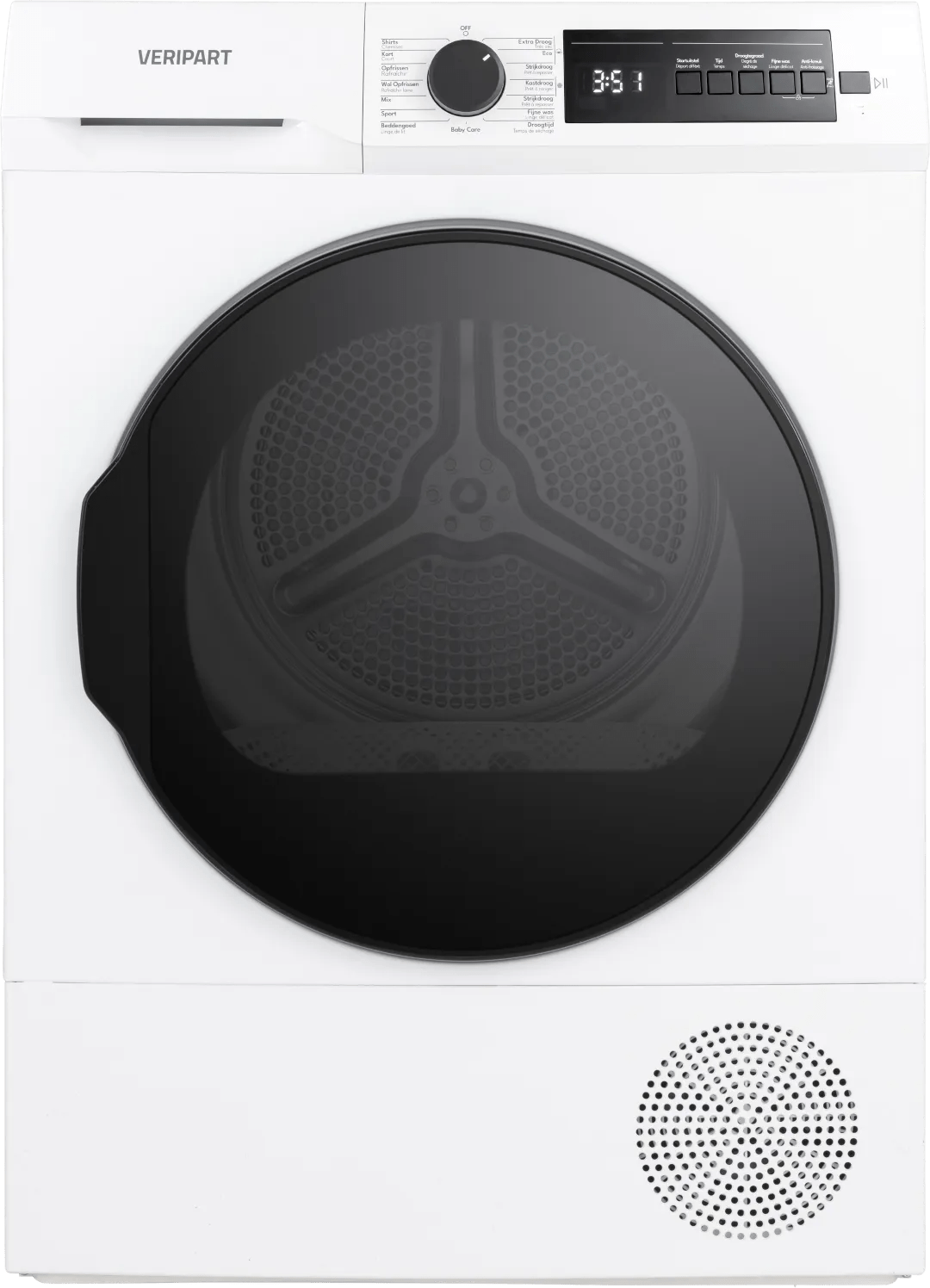De Veripart VPDR8EWNB warmtepompdroger droogt 8 kilogram was in 231 minuten. Zo ligt je dekbedovertrek op tijd klaar voor het weekend. Je kiest uit programma's voor katoen, synthetische stoffen en delicate was. Handig, want zo droog je ook je sportkleding of handdoeken. Tijdens het drogen draait de trommel 2 kanten op. Hierdoor raken je hoeslakens minder snel in de knoop en kreuken ze minder. De vochtigheidssensoren meten hoe droog je was is en stoppen het programma automatisch. Zo droogt je trui nooit langer dan nodig en blijft hij langer mooi. De droger voert het vocht uit je was af met de meegeleverde slang. Die sluit je aan op de afvoer, zodat je het condensreservoir niet meer hoeft te legen.