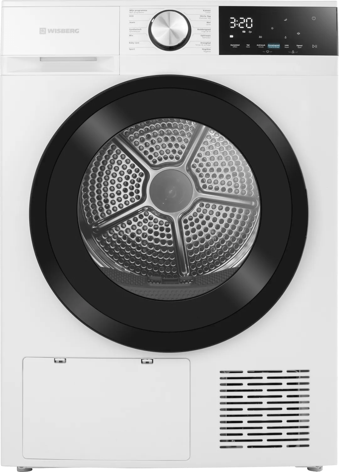 De Wisberg WBDR1400A38WNB warmtepompdroger bespaart energiekosten dankzij energieklasse C. Gemiddeld bespaar je tot &euro: 200,- over de levensduur. Je droogt met 8 kilogram vulgewicht de handdoeken van een paar dagen in één keer. De droger heeft 14 programma's voor bijvoorbeeld katoen, jeans en sportkleding. Heb je katoenen en synthetische was? Droog deze dan tegelijk met het programma 'Mix'. Dit scheelt sorteerwerk vooraf. Met 'Hygiëne' droog je je wasgoed extra hygiënisch. Dit is vooral geschikt voor wat dikkere stoffen, bijvoorbeeld linnen. Zo haal je een tafelkleed droog en schoon uit de trommel. De condensbak leeg je niet dankzij de meegeleverde afvoerslang. Sluit deze aan op de waterafvoer, dan spoelt het vocht automatisch weg.