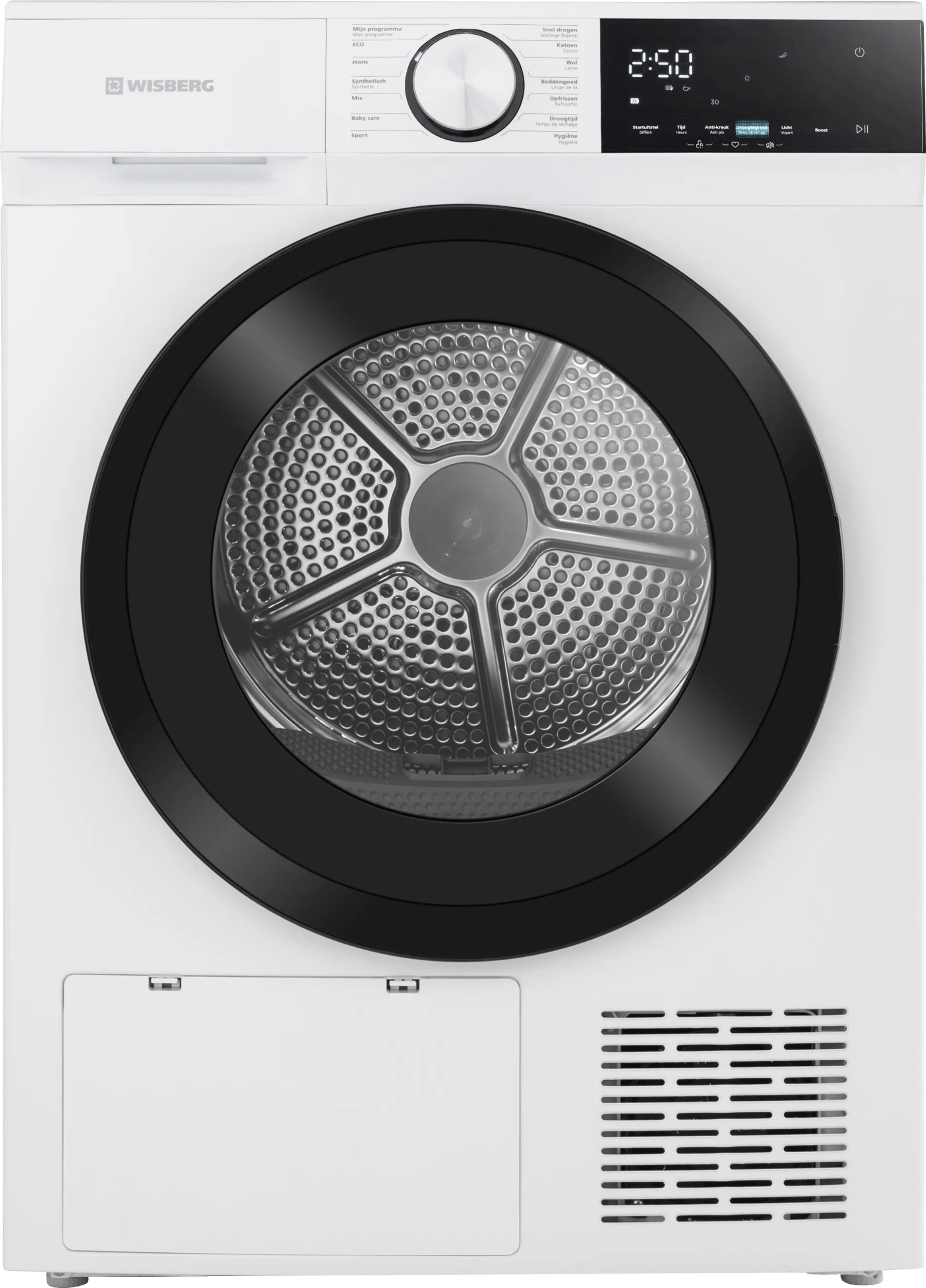 Je droogt je wasgoed energiezuinig met de Wisberg WBDR1BW8NB wasdroger. Dankzij energieklasse B bespaar je flink op energiekosten. Met 8 kilogram vulgewicht heb je ruimte voor kleine en middelgrote ladingen, zoals het beddengoed van één tweepersoonsbed. Met het speciale uv-licht in de trommel droog je je wasgoed extra hygiënisch. Deze doodt alle bacteriën extra grondig. Dit is bijvoorbeeld handig voor knuffels en babykleertjes. De droger heeft 13 verschillende droogprogramma’s. Je droogt je kleding met programma’s voor bijvoorbeeld wol, synthetische kleding, jeans en beddengoed. Wil je sneller droge kleding? Gebruik dan de Boost functie. Hiermee kort je je droogprogramma’s in. Met het Quick Dry programma droog je een kleine hoeveelheid kleding in een korte tijd. Zo heb je snel een droog overhemd.