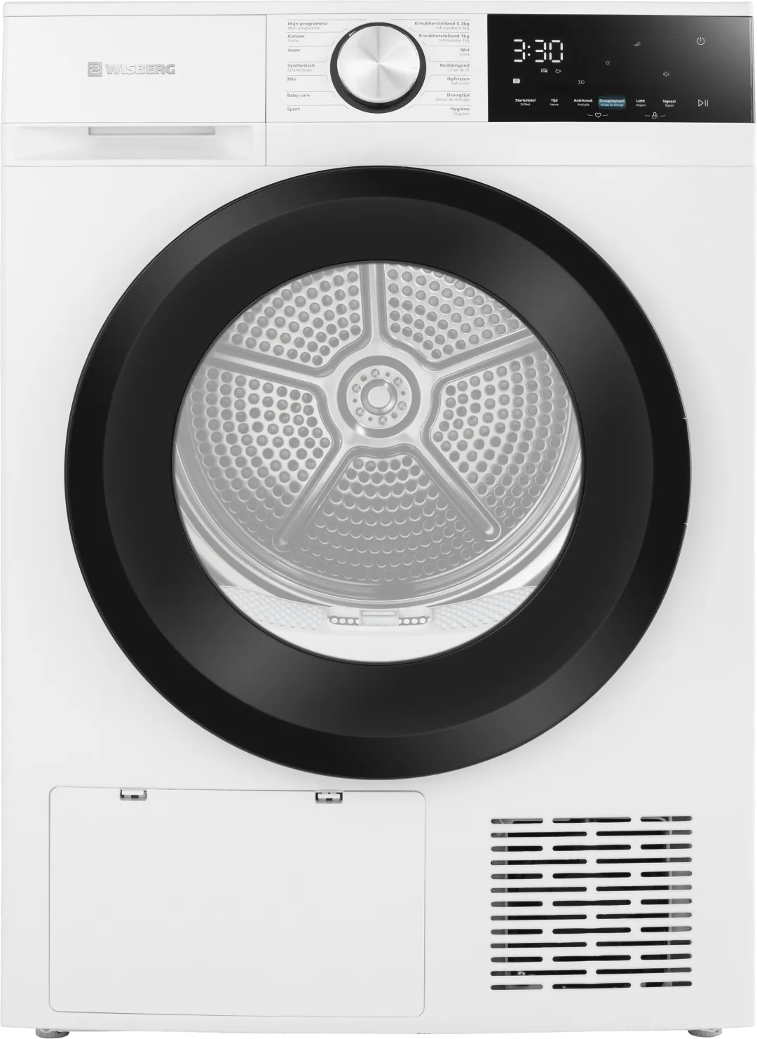 De Wisberg WBDR9A3WNB is een zeer energiezuinige warmtepompdroger voor een grote lading beddengoed. Je hebt hier met 9 kilogram vulgewicht genoeg ruimte voor. Met energieklasse C bespaar je gemiddeld tot &euro: 200,- op je energiekosten over de levensduur. Zo houd je meer geld over in je portemonnee en droog je milieuvriendelijker. De wasdroger heeft 14 programma’s voor bijvoorbeeld bedlakens, katoen en jeans. Voor een extra schone en droge was kies je het programma ‘Hygiëne’, waarmee je op een hogere temperatuur droogt. Hiermee dood je bacteriën en komen je sporthanddoeken frisser uit de trommel. Je voert het vocht uit je wasgoed af met de meegeleverde condensafvoerslang, die je op de waterafvoer aansluit. Zo hoef je de condensbak niet te legen.