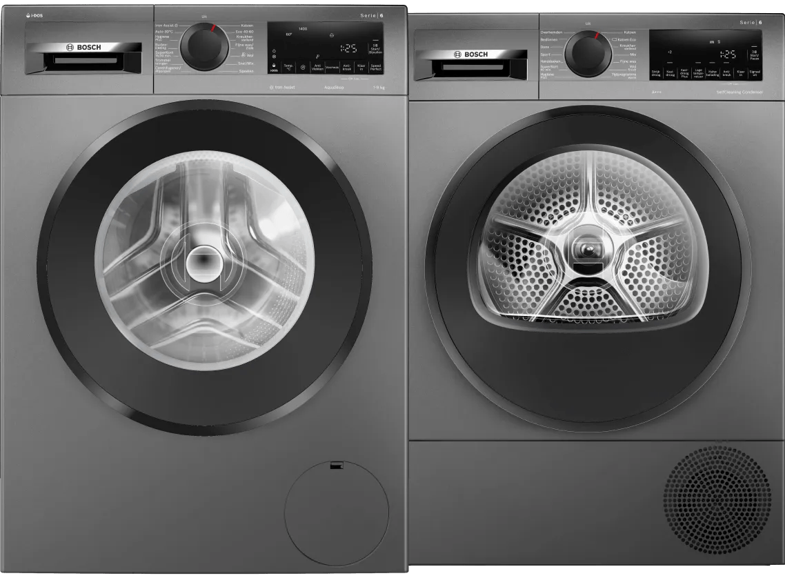 Je bespaart flink op je energierekening met de Bosch WGG244FNNL i-DOS + Bosch WQG235DRNL wasmachine en droger set. Wasmachine Je wast grote ladingen beddengoed en kleding in één keer dankzij 9 kilogram vulgewicht. i-DOS doseert je wasmiddel en wasverzachter automatisch. Zo blijft je kleding langer mooi. Haal je je overhemden gekreukt uit de kast? Met de Iron Assist stoomfunctie verwijder je kreukels en verminder je strijkwerk. Wanneer het wasprogramma te lang duurt, kort je dit in met SpeedPerfect. Zo was je tot 65% sneller. Wasdroger Na het wassen past er 8 kilogram wasgoed in de droogtrommel. Je kiest uit 1 van de 14 verschillende droogprogramma's voor je was. Heb je last van allergieën? Droog je schone lakens dan met Hygiene Plus. Hiermee verwijder je bacteriën en allergenen grondig uit je was. Na het drogen spoelt de condensor automatisch schoon. Dit bespaart jou onderhoud en zorgt dat de droger altijd even zuinig blijft.