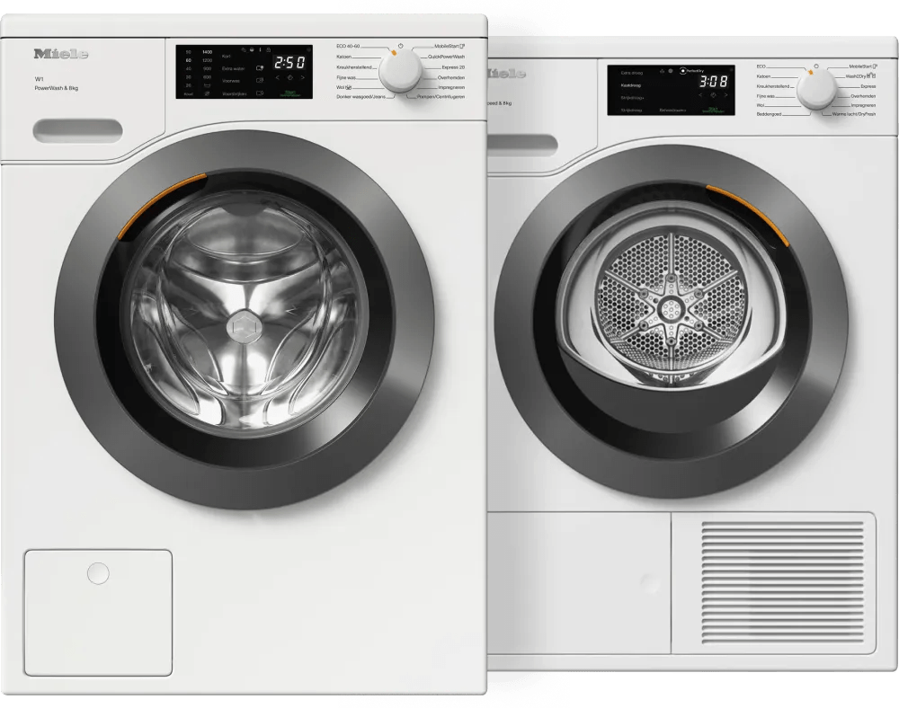 Met de Miele WEB 368 WCS PowerWash + Miele TEC 648 WP EcoSpeed & Wash2Dry koppel je je wasmachine aan je droger en stem je de programma's op elkaar af. Wasmachine Je kiest op afstand een programma dankzij bediening via een app. Wanneer je was schoon is, krijg je een melding op je telefoon. Met PowerWash bespaar je tijd en was je een halfvolle trommel in 49 minuten schoon. Zo leg je je handdoeken sneller terug in de kast. Met energieklasse A-20% bespaar je tot &euro: 270,- op je energiekosten over de levensduur. Droger Met Wash2Dry koppel je je wasdroger via je smartphone aan je Miele wasmachine. Wanneer je deze functie gebruikt, neemt het droogprogramma de instellingen over van je laatste wasprogramma. Hiermee blijft je wasgoed langer mooi. Met EcoSpeed droog je snel en zuinig een volle trommel. Je beddengoed is na ongeveer 3 uur droog, wat relatief snel is voor een warmtepompdroger met 8 kilogram vulgewicht.