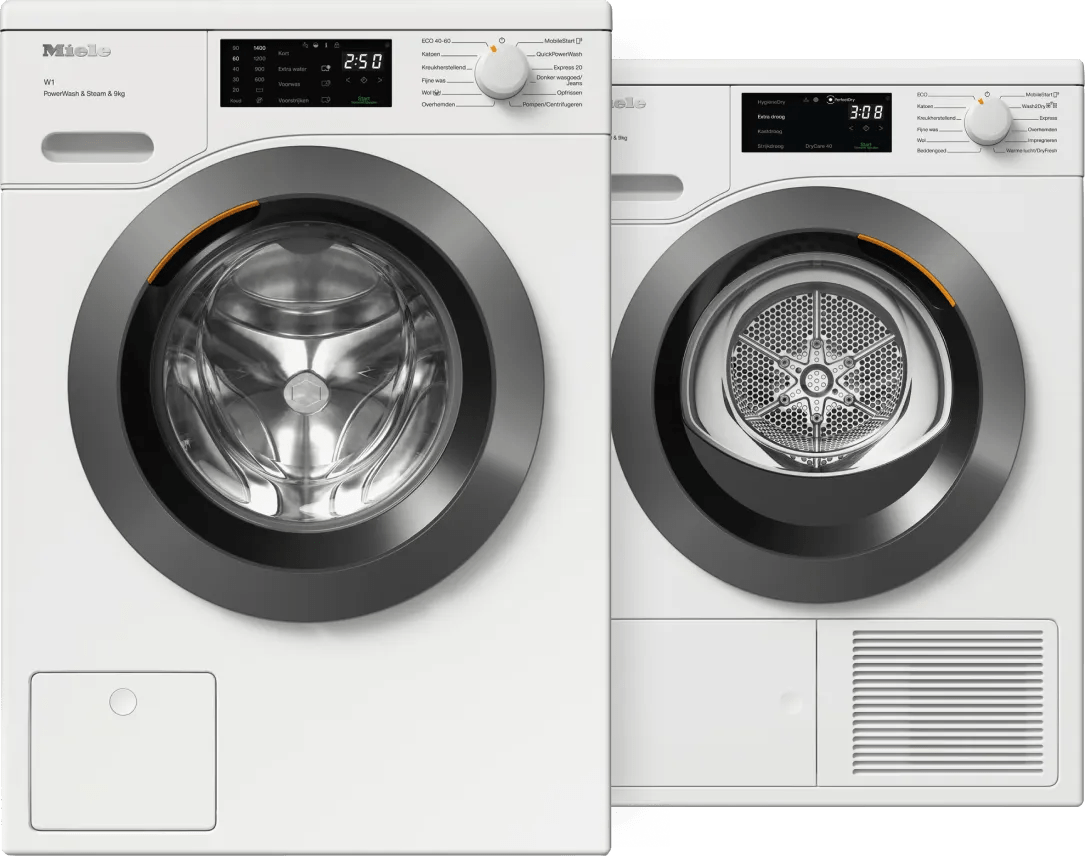 Koppel de Miele WED 388 WCS PowerWash & Steam wasmachine aan de Miele TED 648 WP EcoSpeed & Wash2Dry droger en pas de programma's op elkaar aan. Wasmachine Met 9 kilogram vulgewicht was je een grote lading beddengoed in één keer. Dit doe je energiezuinig met energieklasse A-20%, waarmee je tot &euro: 270,- op je energiekosten over de levensduur bespaart. Ook bespaar je tijd met PowerWash. Hiermee was je een halfvolle trommel in 49 minuten schoon. Je bedient de wasmachine op afstand via een app op je telefoon. Droger De C warmtepompdroger bespaart tijd en energie met EcoSpeed. Zo droog je alles energiezuinig in ongeveer 3,5 uur, wat relatief snel is voor zo'n grote lading was. Met Wash2Dry neemt de droger de laatste instellingen van je wasmachine over. Hierdoor droog je je was iedere keer op de juiste manier en blijft deze langer mooi.