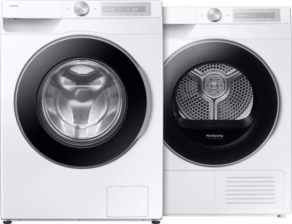 Met de Samsung WW90DG6U25LH AI Wash + Samsung DV90DG6845LHU3 AI Dry+ was en droog je zuinig 9 kilogram wasgoed.