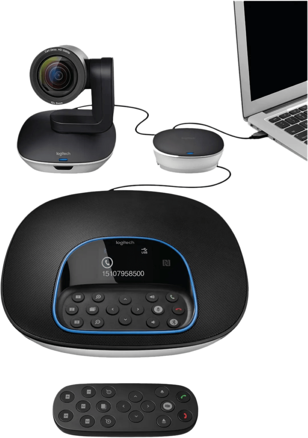 Werken je collega's thuis of samen met jou op kantoor? Met de Logitech Group Conference Cam merk je geen verschil, zelfs niet als je met meer dan 10 mensen vergadert. De speakerphone heeft namelijk 4 360 graden microfoons, hierdoor zijn sprekers in een omtrek van 6 meter rondom het basisstation duidelijk te verstaan. De Full HD camera met 10X optische zoom zorgt ervoor dat elke spreker duidelijk in beeld komt. Met de afstandsbediening draai, zoom en kantel je de camera op afstand. De Logitech Group verbind je via bluetooth, NFC of usb met een laptop, tablet of mobiele telefoon en je vergadert meteen met de rest van de wereld. Let op: alle apparaten uit deze set verbind je bedraad. Om contact te maken met je laptop of mobiele apparaat gebruik je ook Bluetooth.