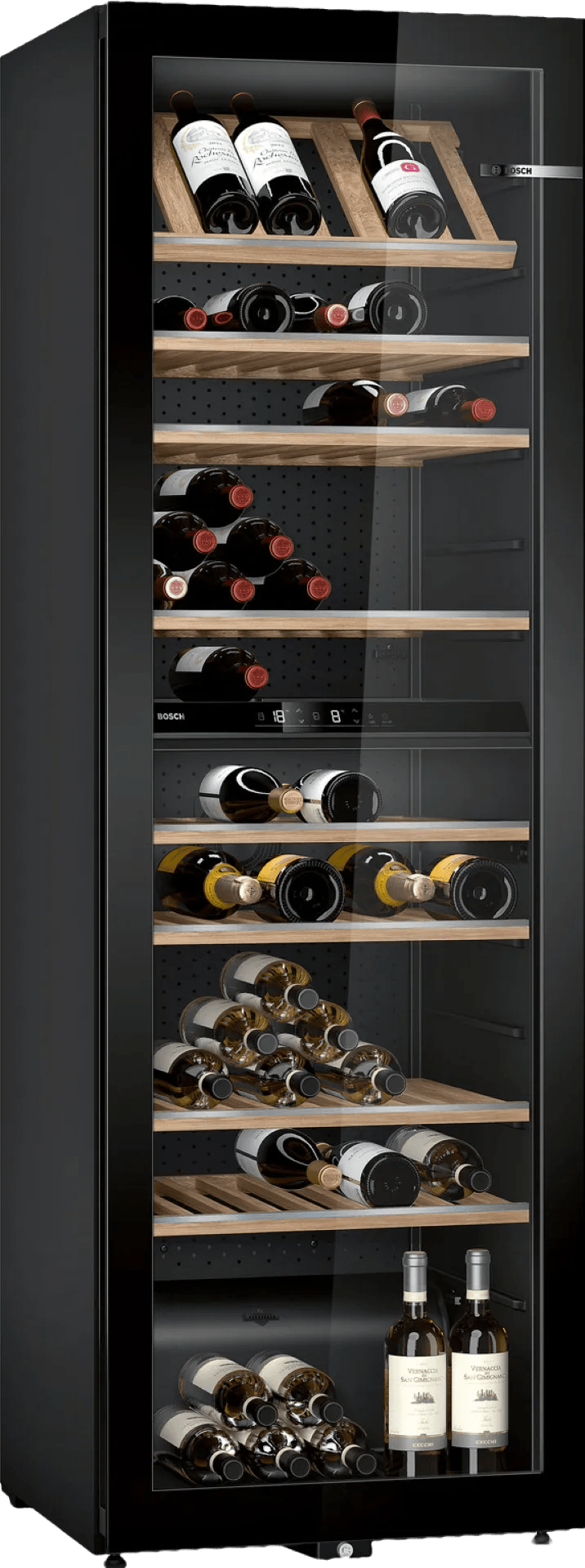 Je hebt genoeg ruimte voor al je wijnflessen in de Bosch KWK36ABGA. Op de 10 houten wijnrekken is er plek voor 199 flessen. Je bewaart zowel rode als witte wijn dankzij de 2 aparte temperatuurzones. Beide zones hebben uittrekbare plateaus en hebben een in te stellen temperatuur van 5 tot 20 graden Celsius. Wanneer je een fles wijn pakt, gaat de led verlichting aan. Zo zie je ook in de avond precies welke flessen je op voorraad hebt. Waar je de flessen ook plaatst, dankzij de glasdeur met uv coating is de wijn veilig van schadelijke invloeden van buitenaf.